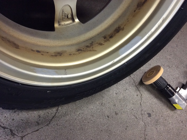 長年使用していたアルミホイールの場合、この「両面テープの残カス」が手強いことがあって、ピットスタッフはせっせとのり剥がしをしています。