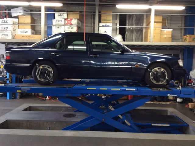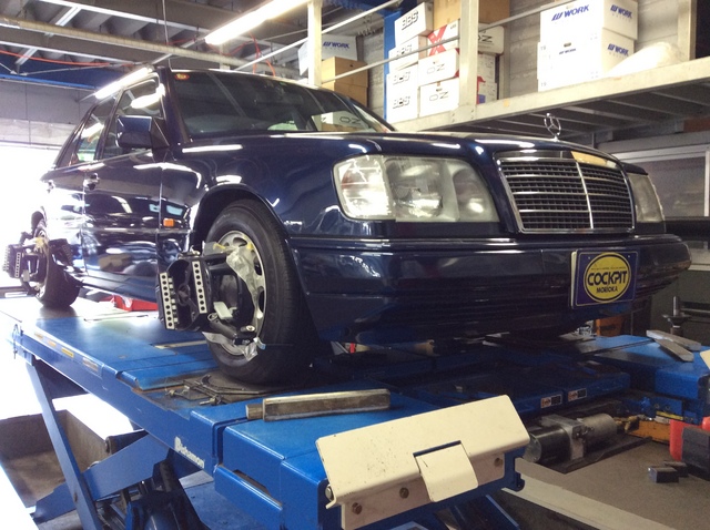 アライメント調整には足廻りをリフレッシュした メルセデス W124 が入庫しています。