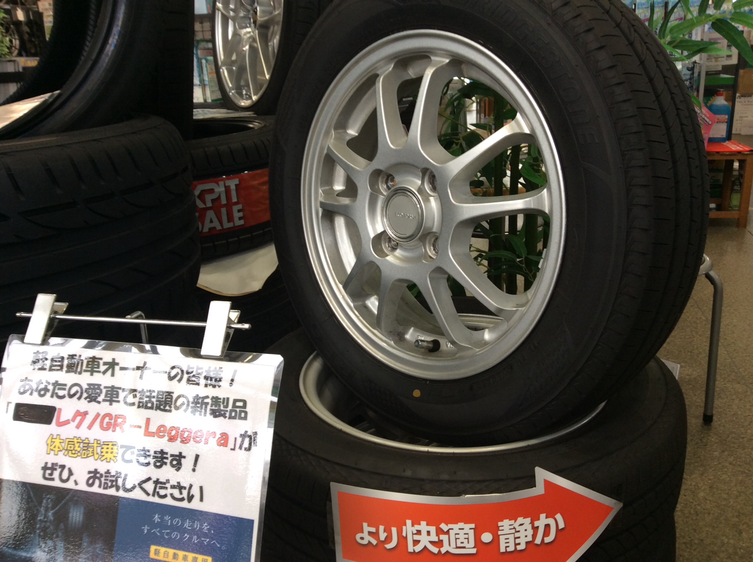 サイズは155/65R14です。エコフォルムとセットしてありますので、ほとんどの軽自動車でお試し装着ができると思います。