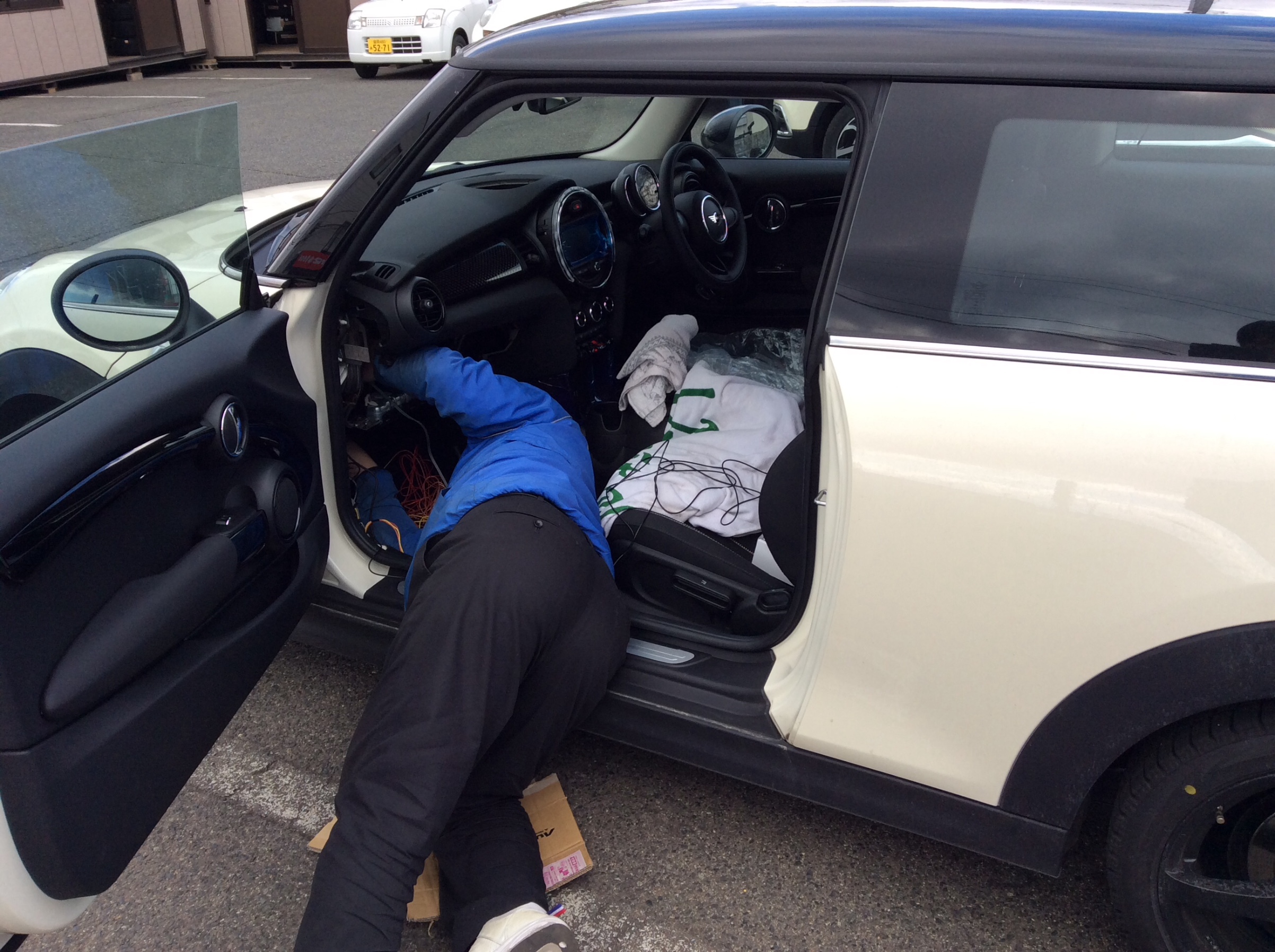 今日もおクルマに潜り込むのはチーフ白川です。