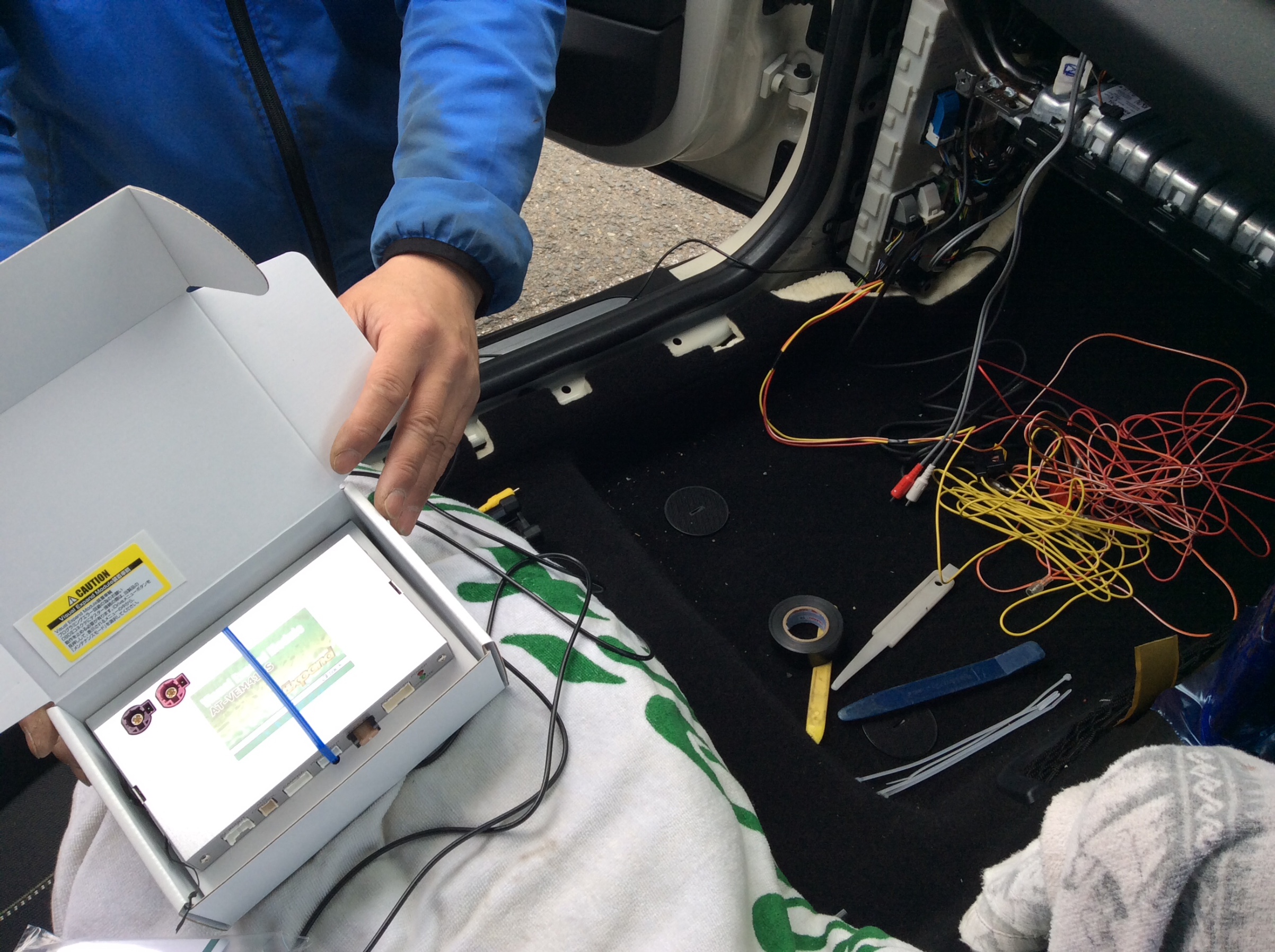 映像の入口はエイタック製 AT-VEM418Sというインターフェイスユニットを純正のモニターケーブルに割り込みさせて外部からの映像を映します。