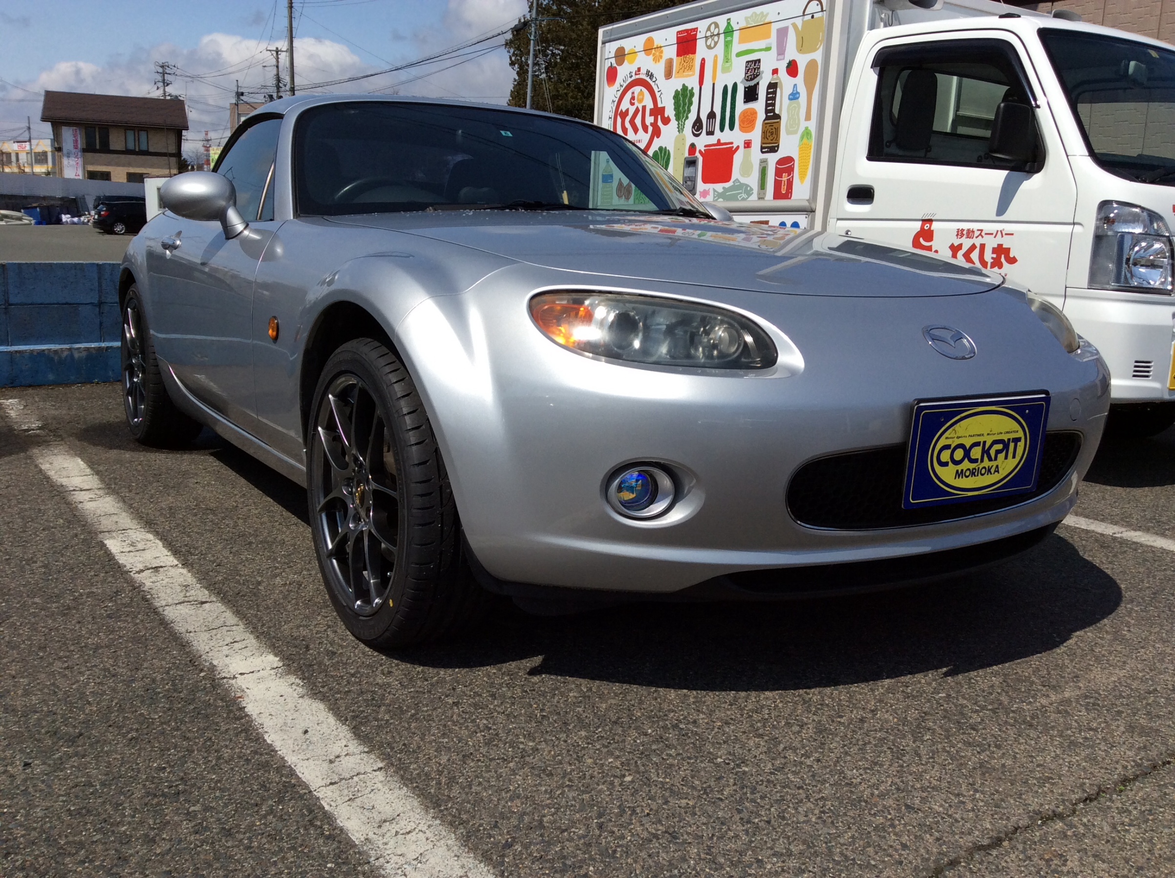 BBS RF とPOTENZA S001をセットしたNCロードスターは、これからレカロシートの取付とアライメント調整をします。