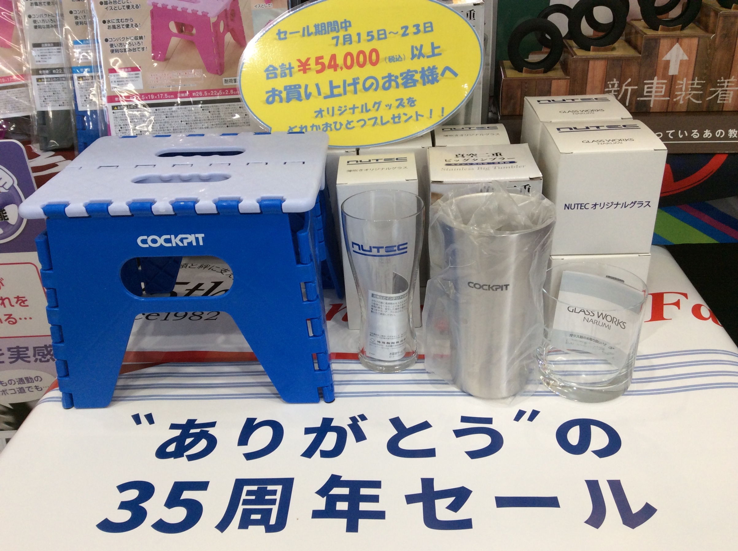 セール期間の7月15日(土)〜7月23日(日)に、タイヤ・ホイール・足廻り品・オーディオなど、合計 ¥50,000 (税別) 以上 お買い上げのお客様 先着30名様に、オリジナルグッズをどれかおひとつ差し上げます!