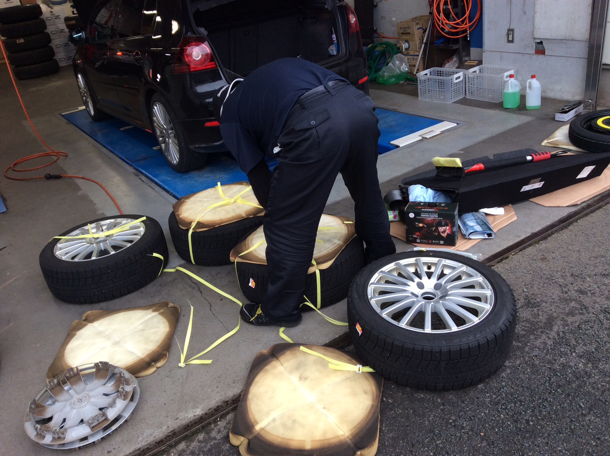タイヤクロークの春に洗って保管しておいたタイヤは、梱包をほどいて取り付けにかかります。