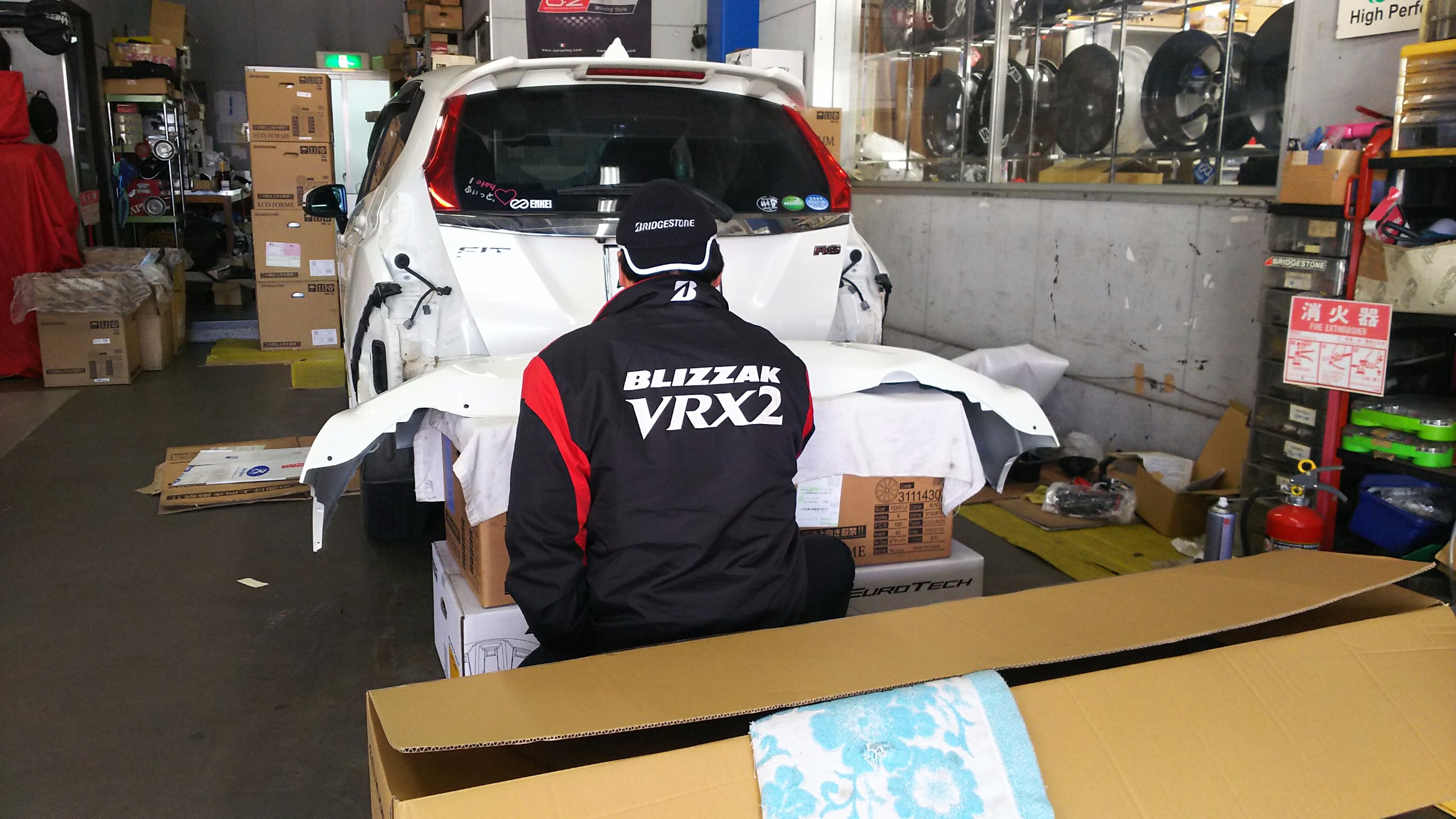 PITではリヤバンパーが外れたフィットRSが…