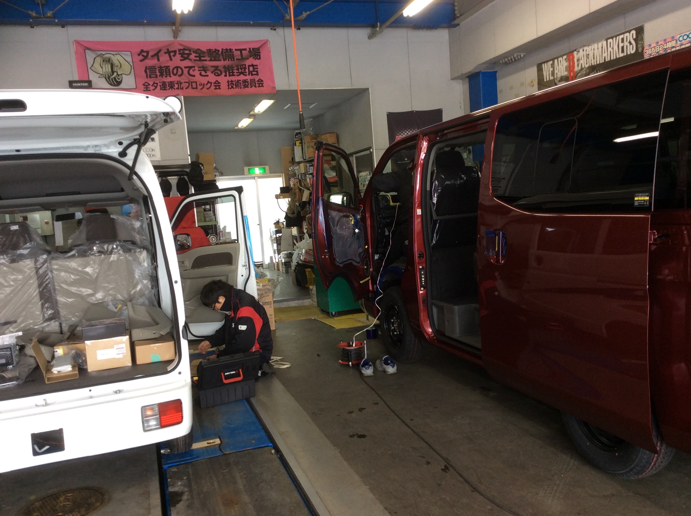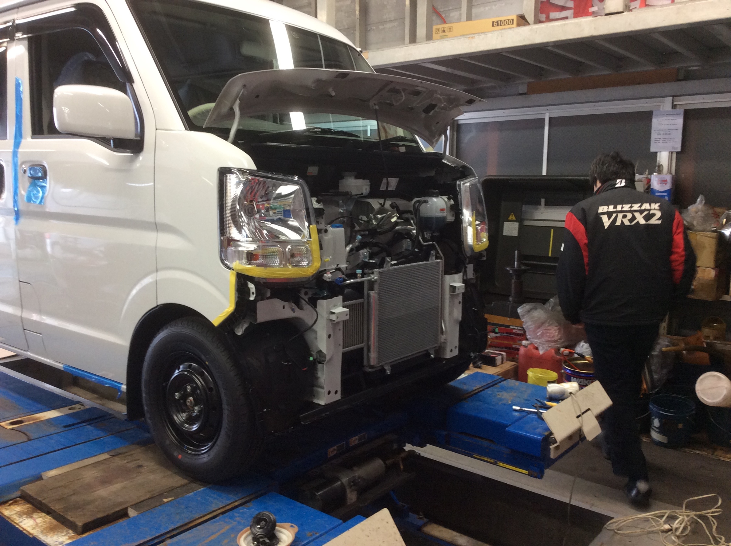 エブリイの右隣で作業が進められているのは、こちらも新車の NISSAN キャラバン NV350 。