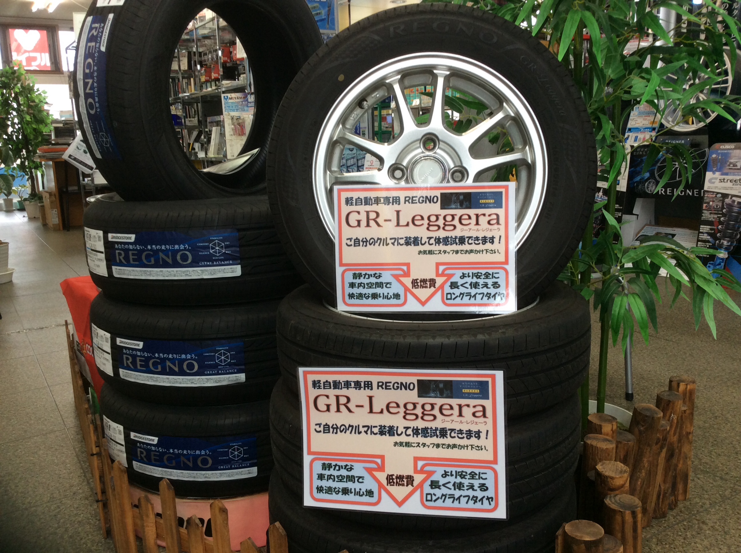 店頭に、直ぐに装着して試乗できるように『REGNO GR-Leggera』とホイールセットを用意しております。