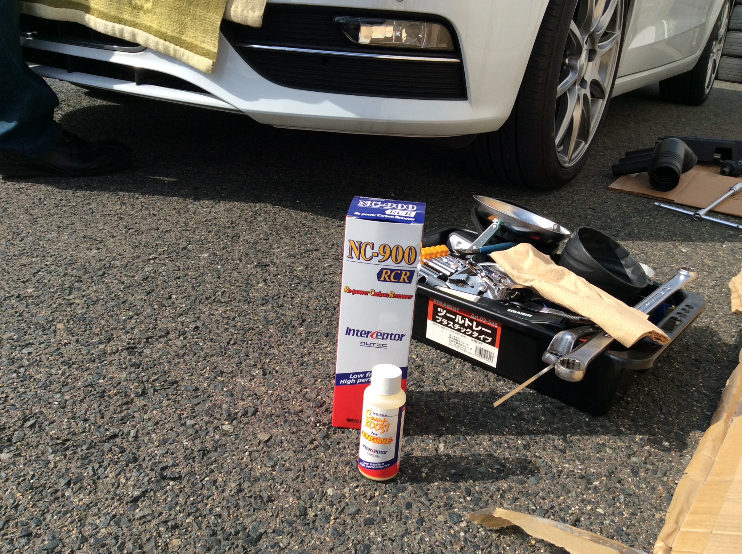 NUTECの専用「ケミカル」でエンジンの燃焼室に溜まったカーボン汚れをクリーニングしていきます。