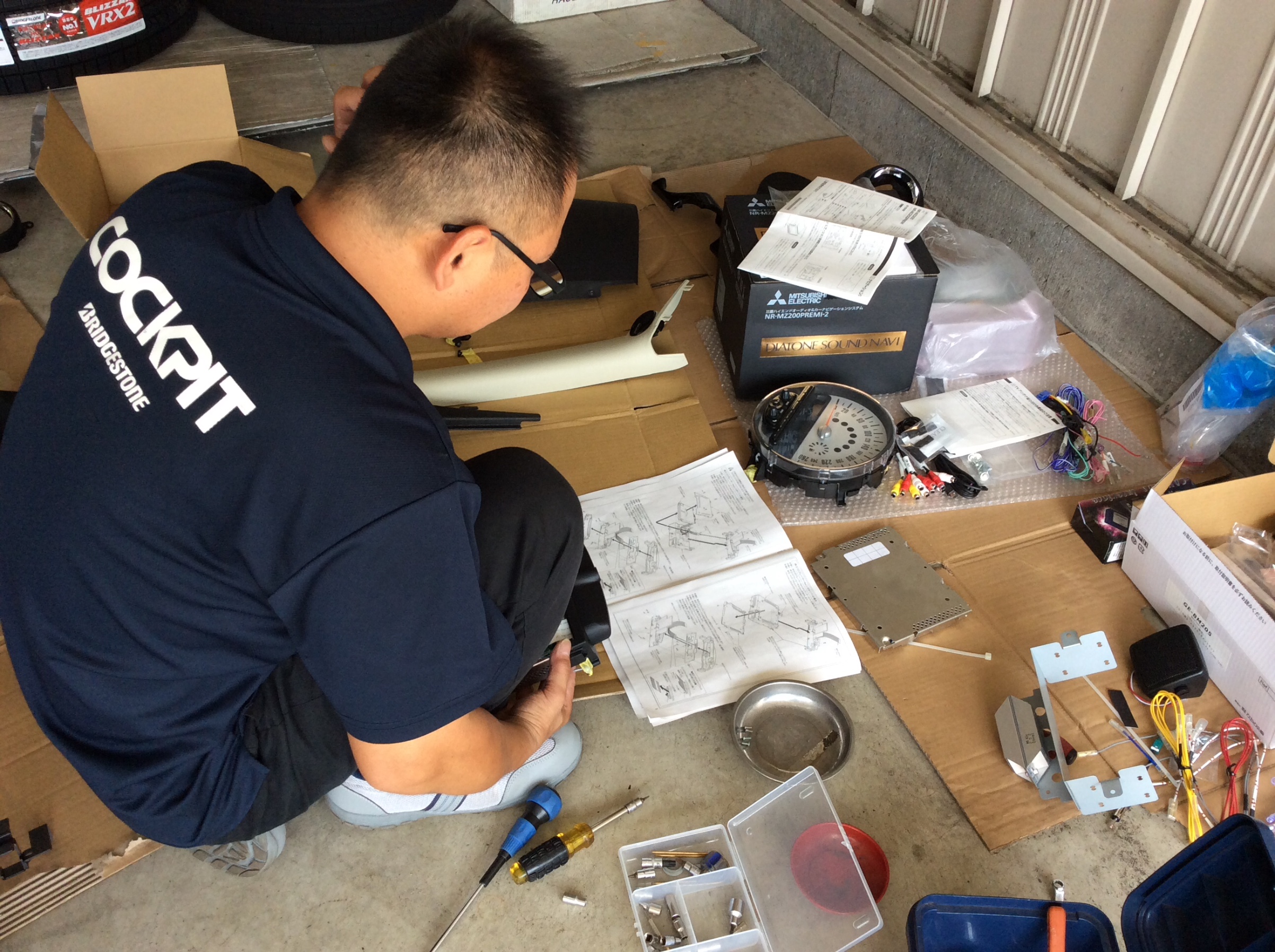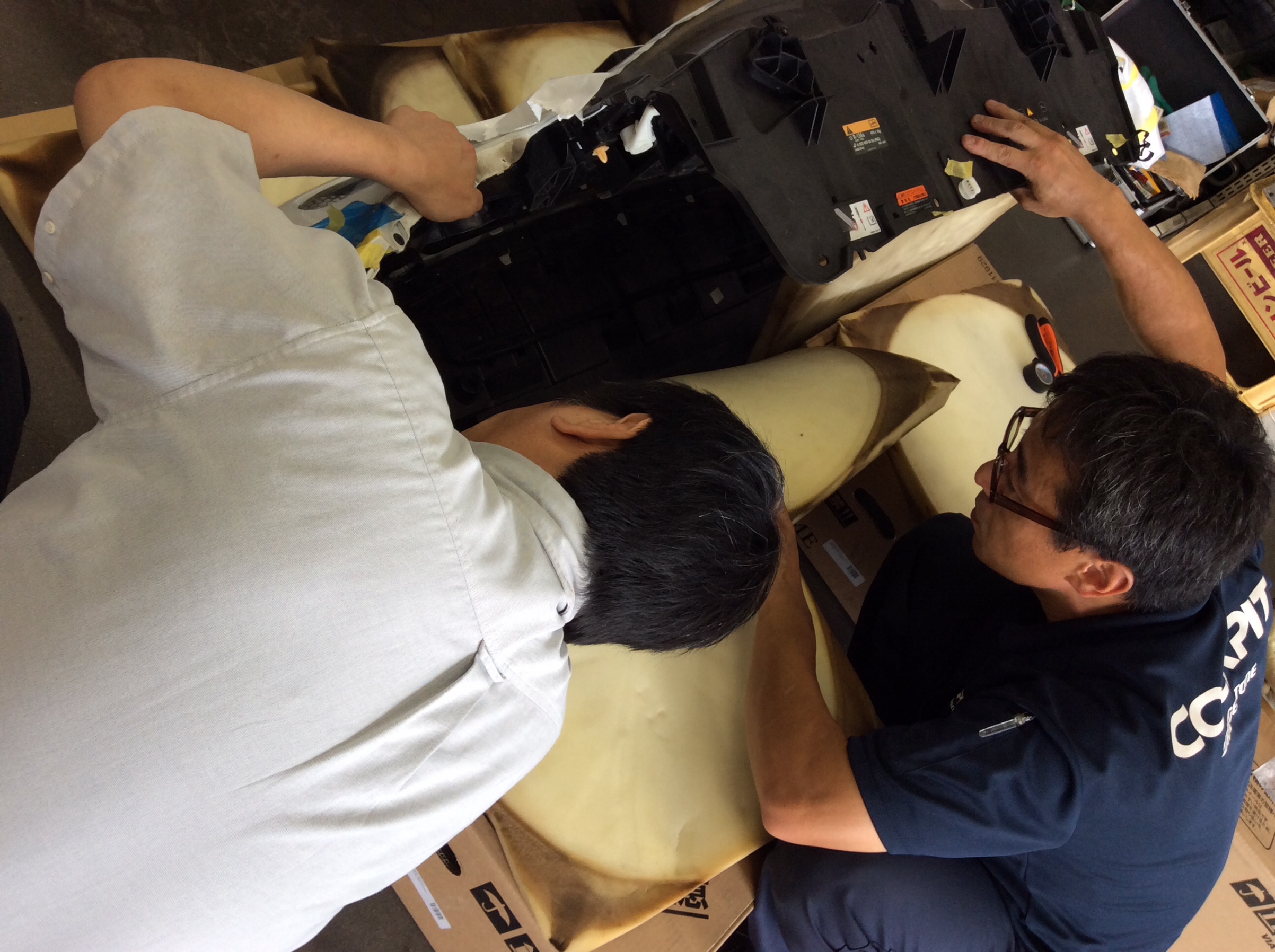 取り付けるモノを並べて図面を覗き込むのは、バラバラ担当のおなじみ チーフ白川。