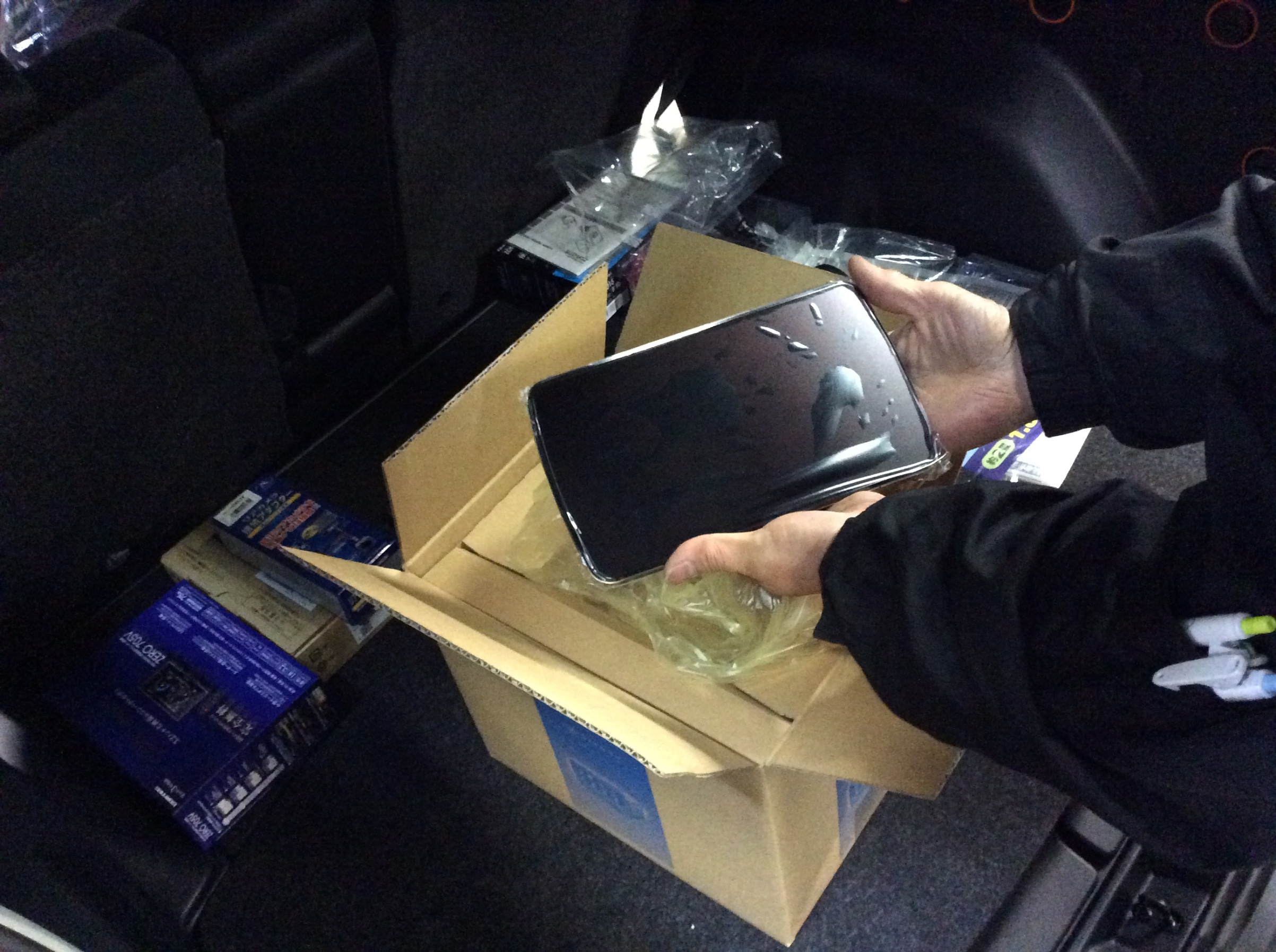 ナビの他にもいろんなパーツの取付けを同時に進めていますので、今日は2人がかりで取付けしています。