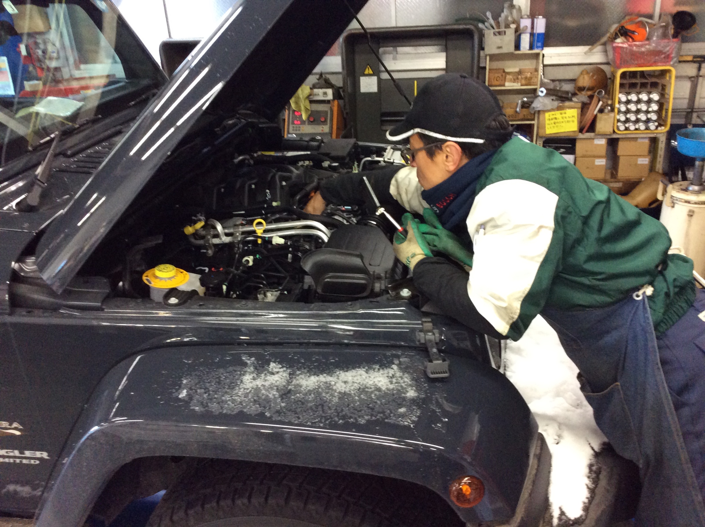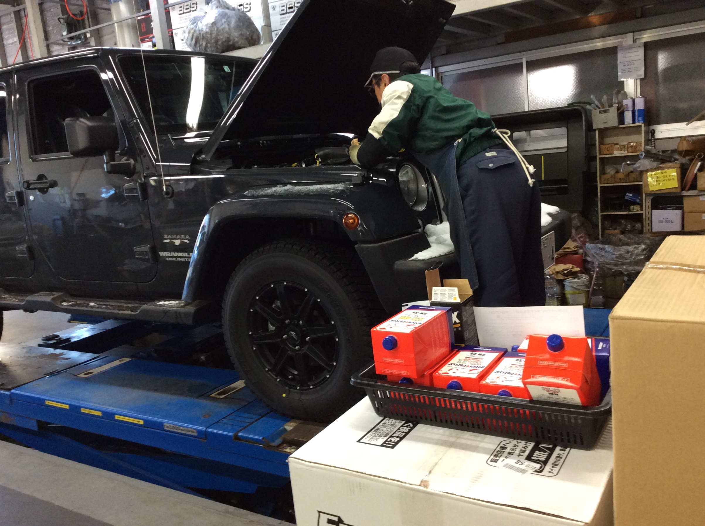 今日の作業の 『 ジープ ラングラー 』 はオイル交換作業の予約をいただ時に車検証のコピーをいただいたので、あらかじめオイルフィルターを準備しての作業ができました。