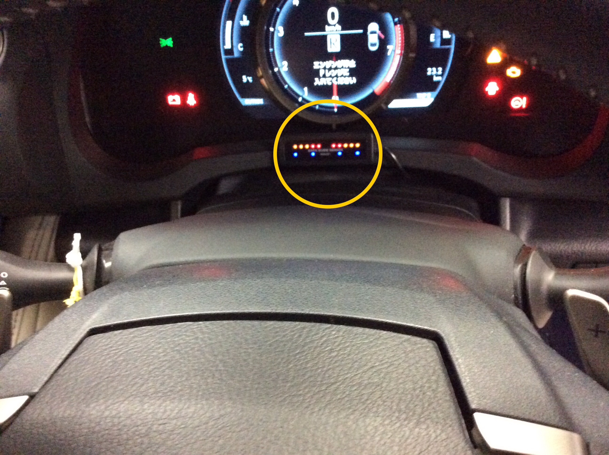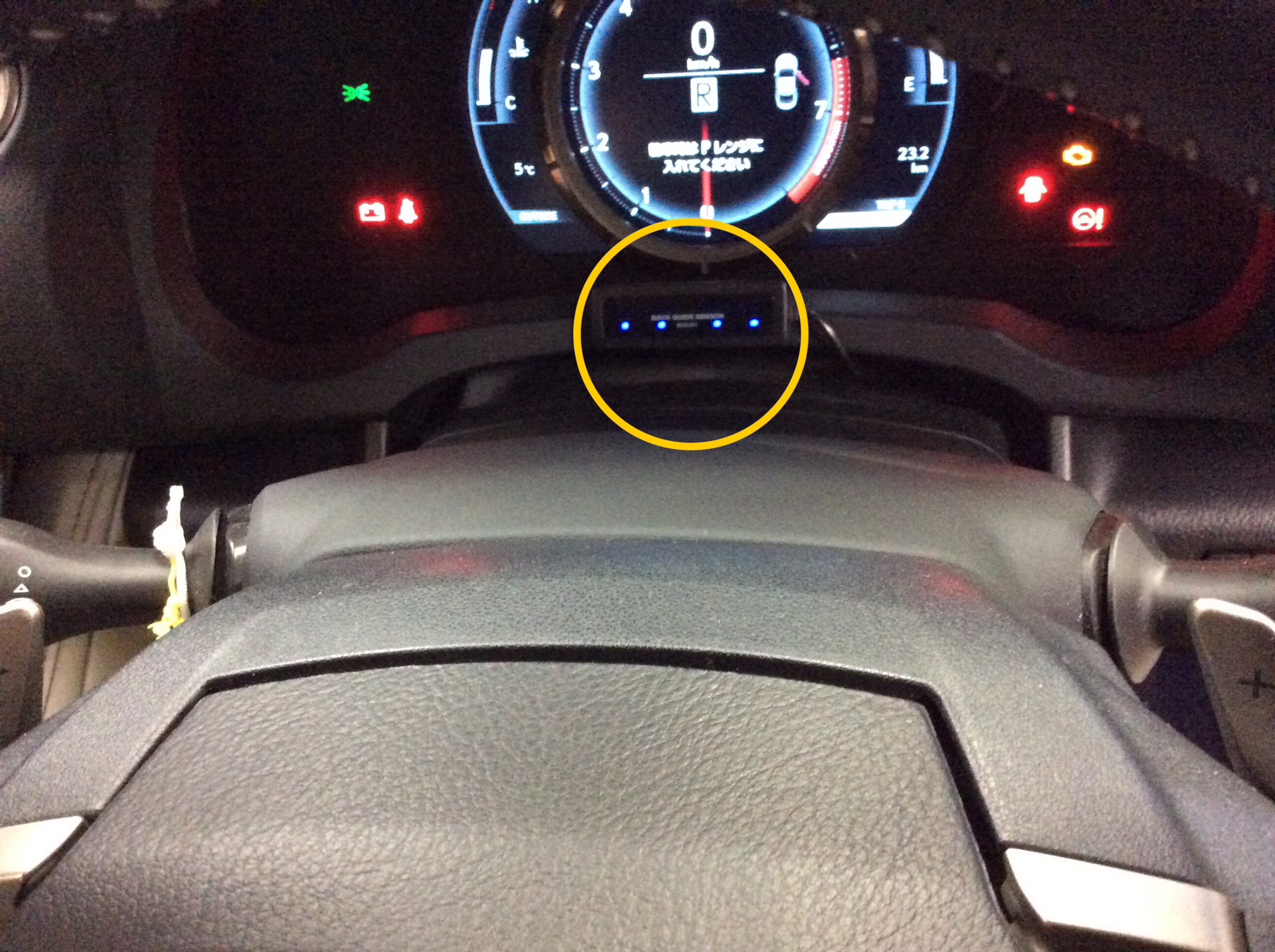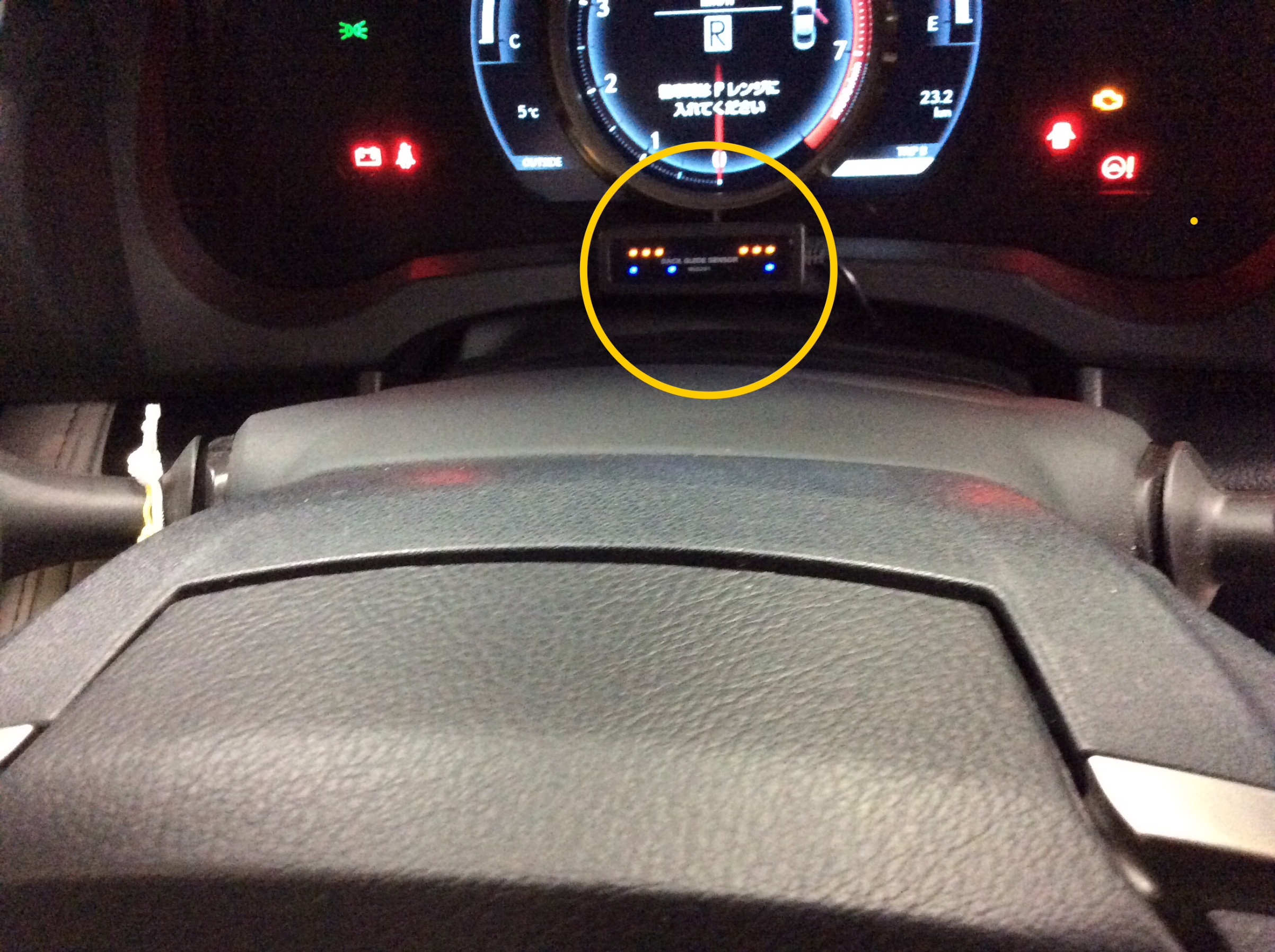 センサーのモニターは確認しやすいようにメーターとステアリングの間に取り付けました。