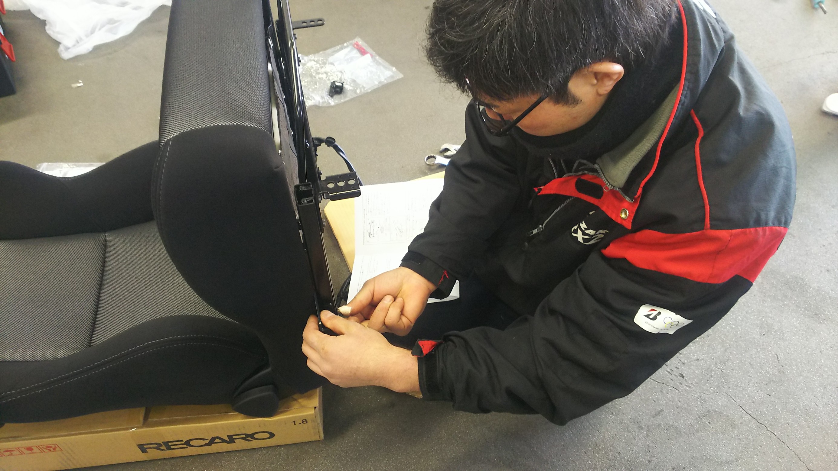 組込み後、車両へ装着。お客様に座っていただき、ポジション調整後完成です☆