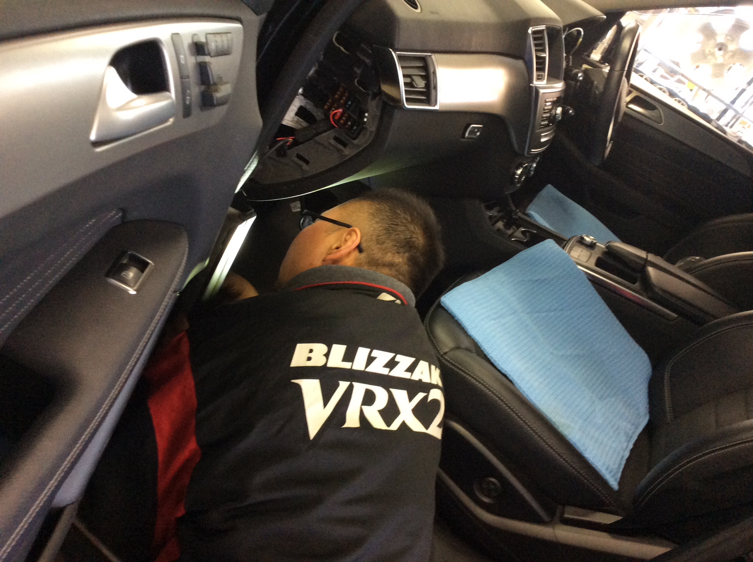さて取り付けは、いつものようにおクルマに潜り込んで配線処理を進めます。