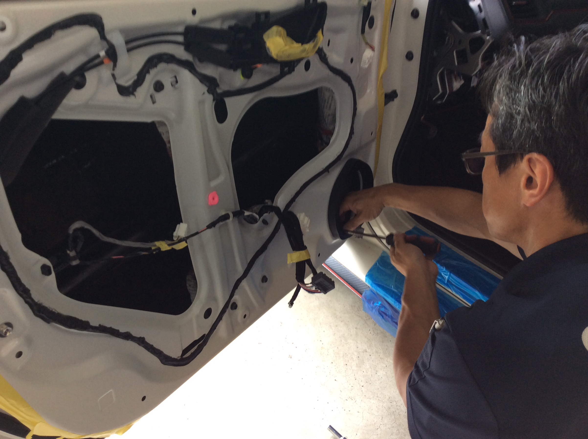ドアの内装も取り外して作業します。