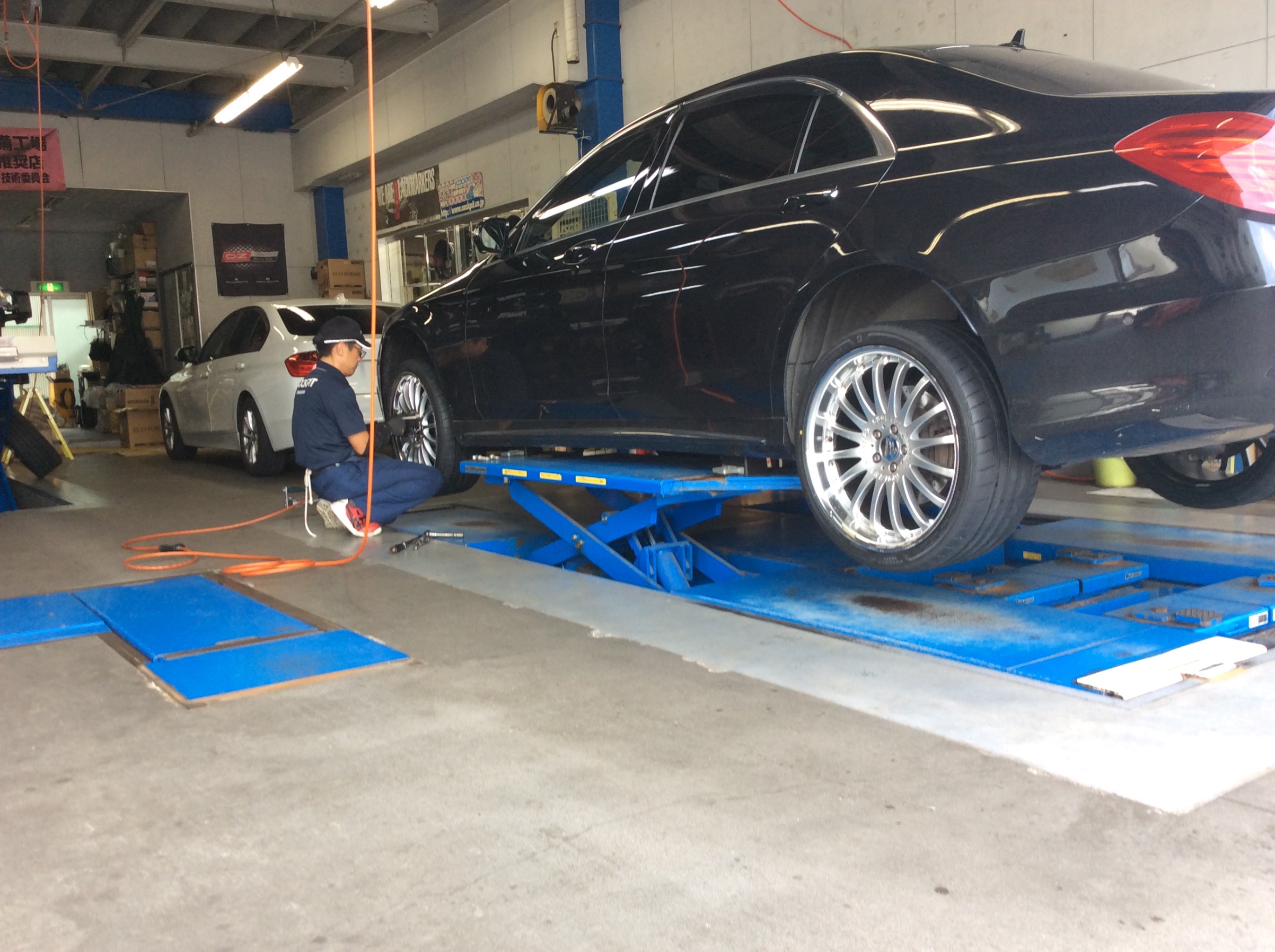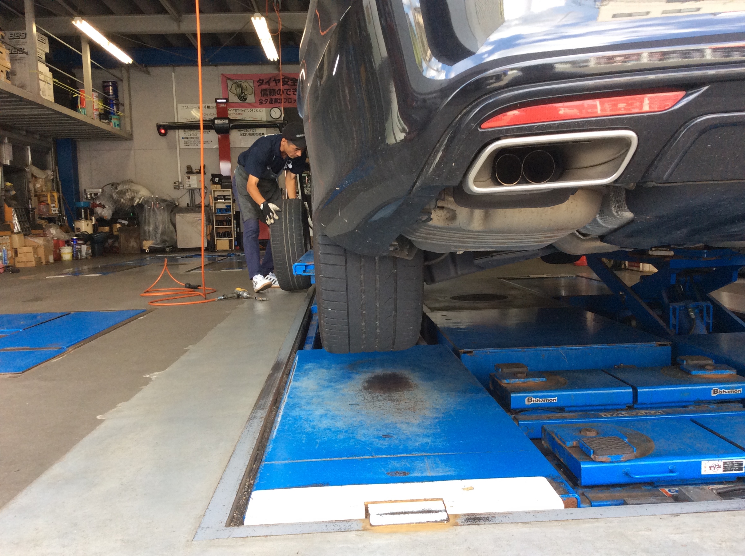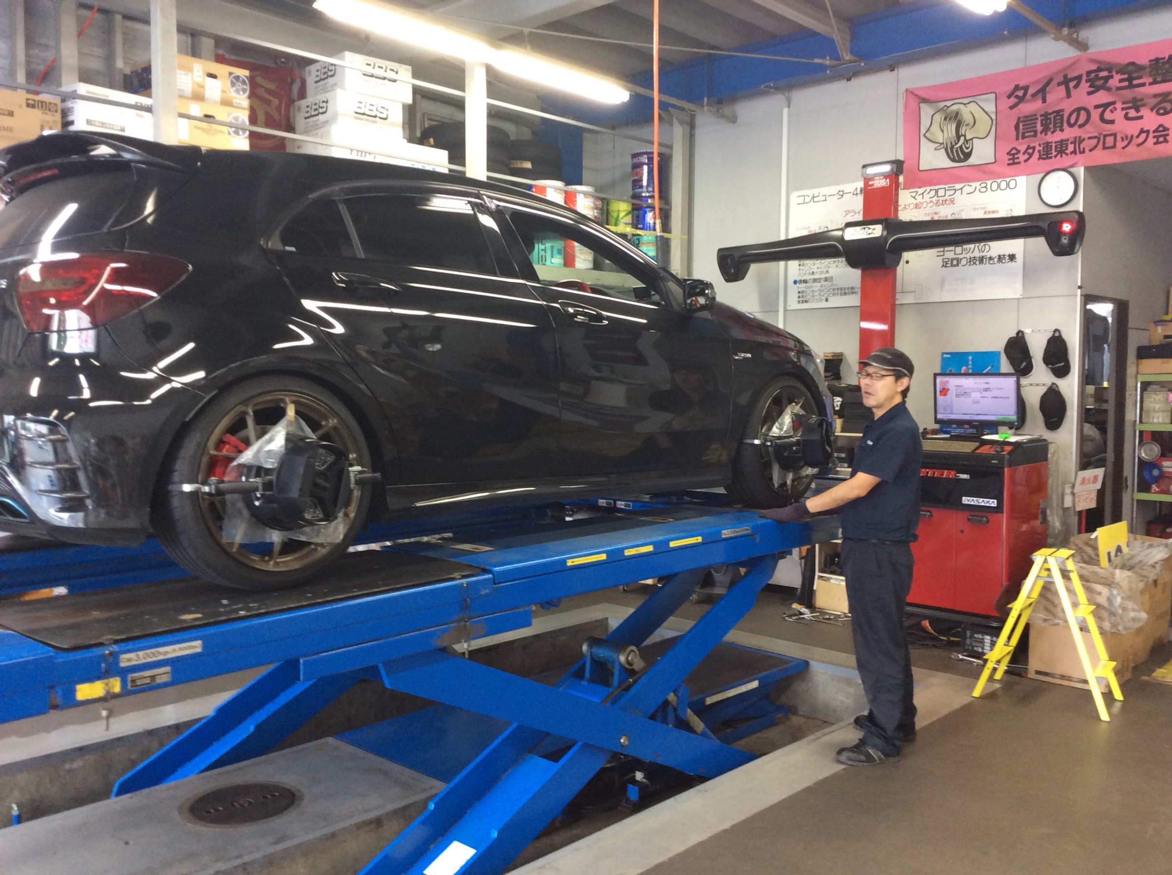 隣のリフトでは、こちらも先日《 POTENZA S007A 》を装着した「 A45 AMG 」が同じく仕上げの《 アライメント調整中 》です。