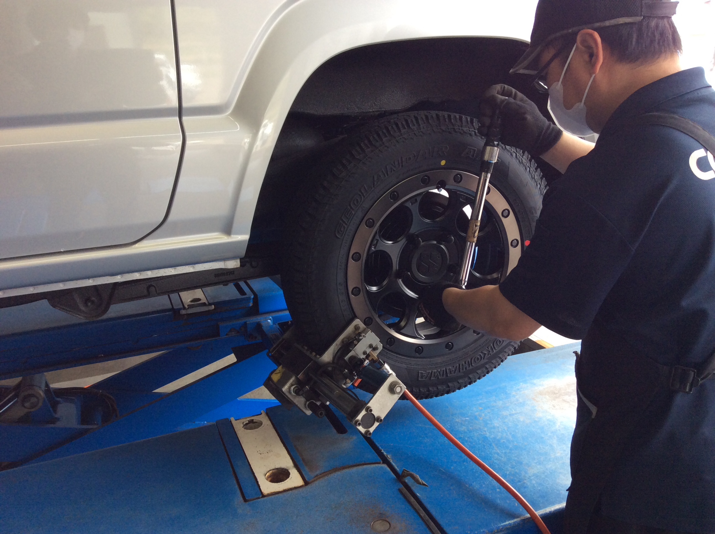 タイヤに専用のマシンで振動を与えて少しずつナットを締め込んでいきます。