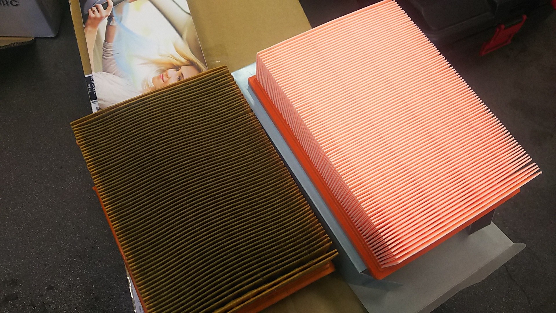 定期的に交換されているお車ですが、エアフィルター・エアコンフィルターともに汚れが蓄積されてましたね。