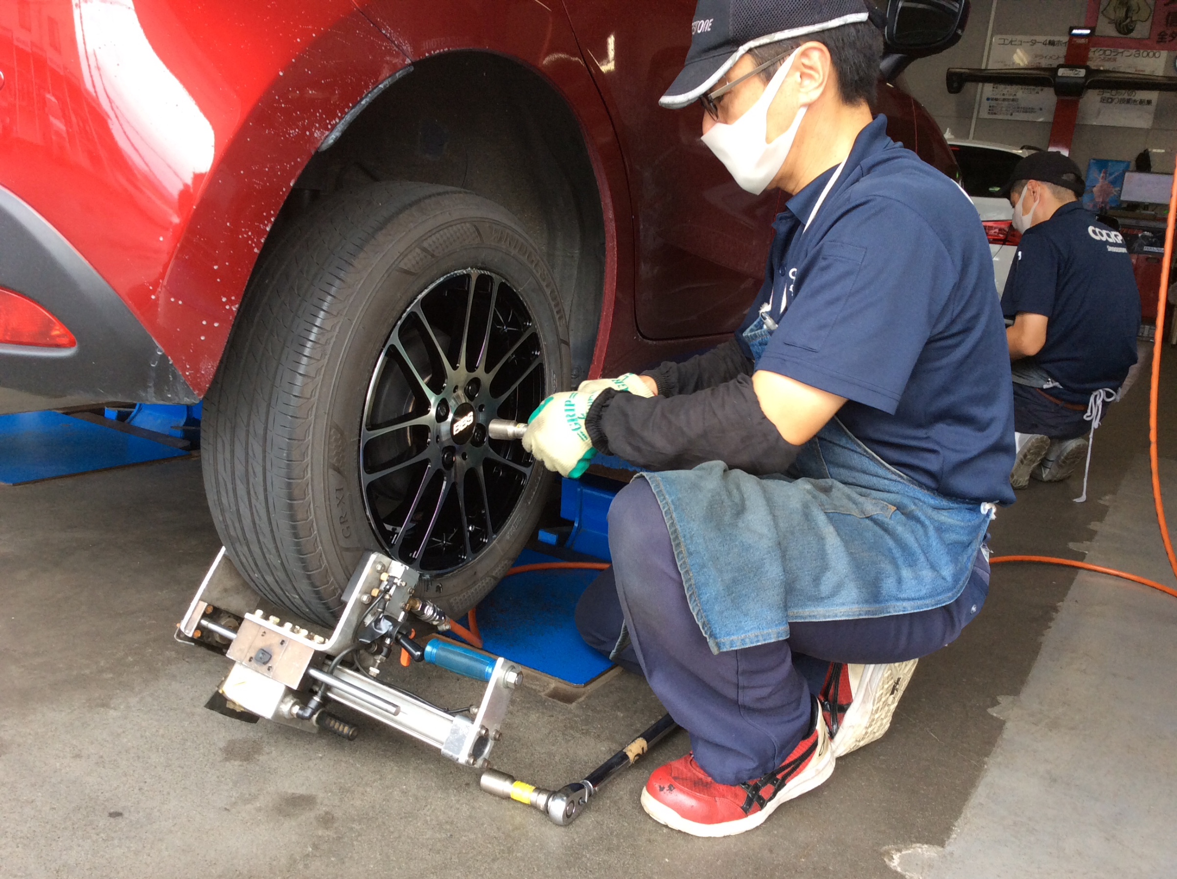 『 BシステムセンターFIT サービス 』では、タイヤ部分に専用の機械を付けて特殊な振動を与えながらタイヤを正確に車軸のど真ん中に履かせていきます。