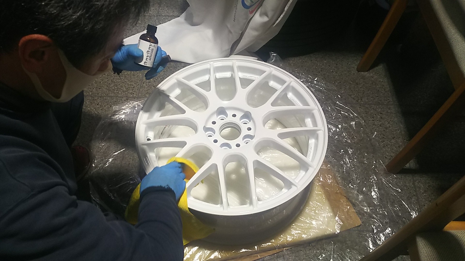 到着後、こちらもご用命いただいておりました「anyanyホイールガラスコーティング」を施工。