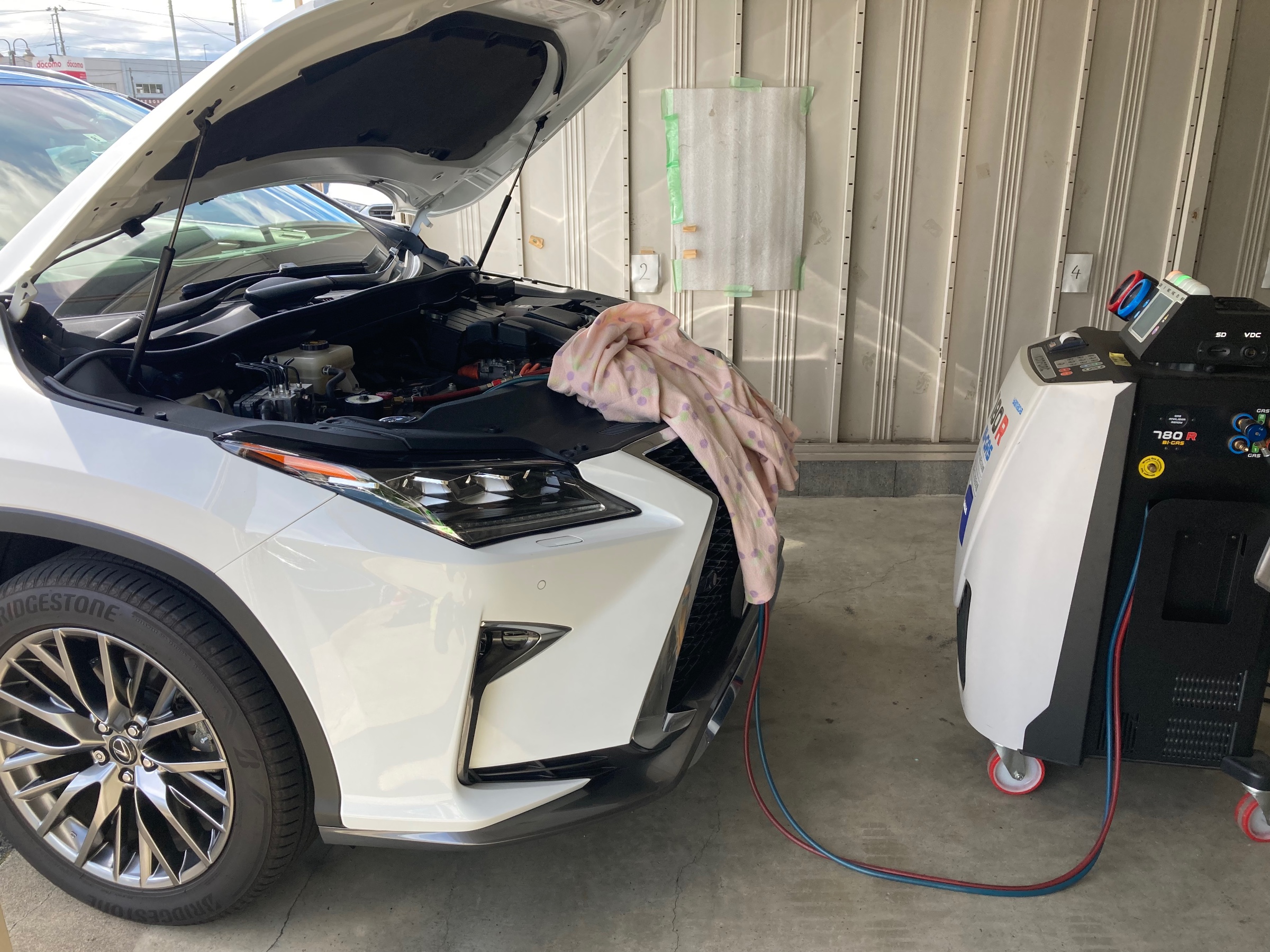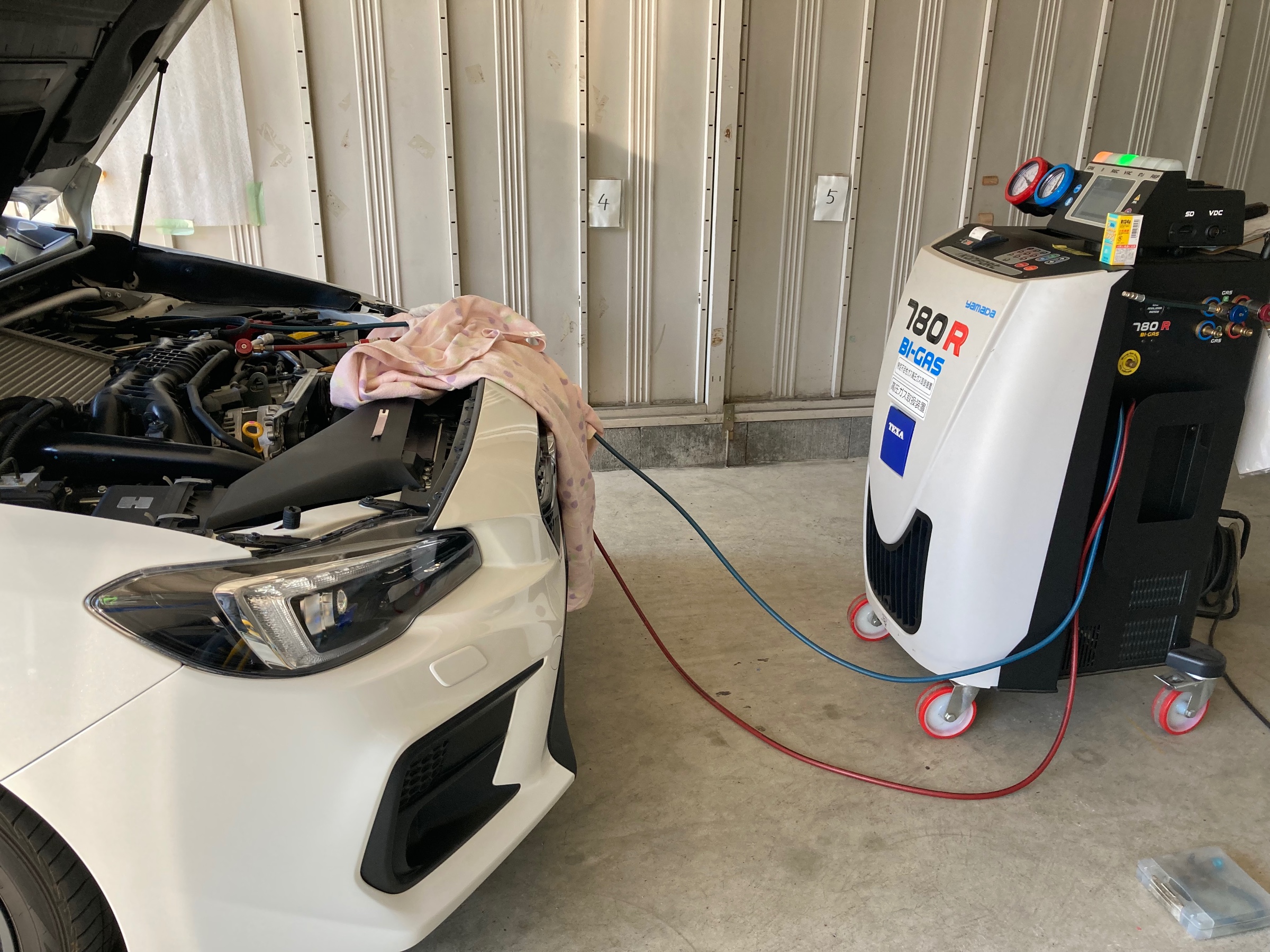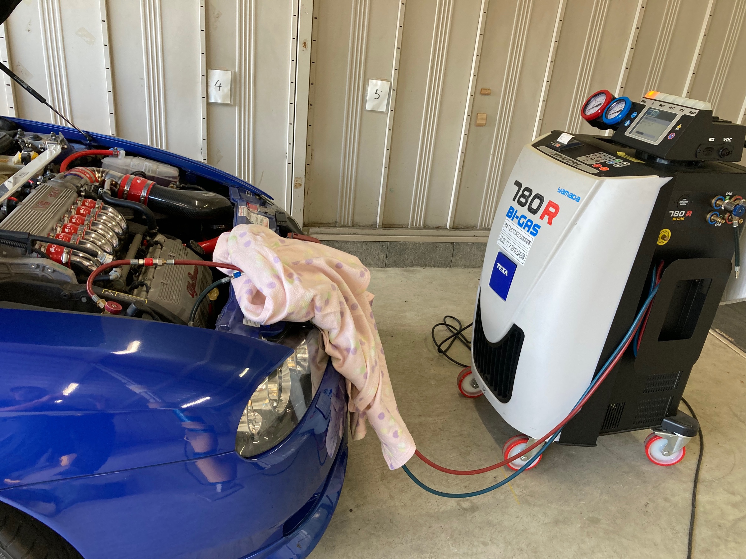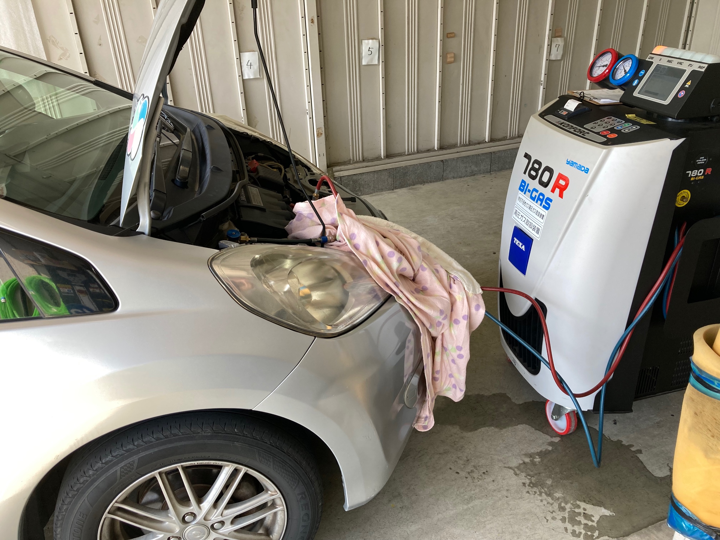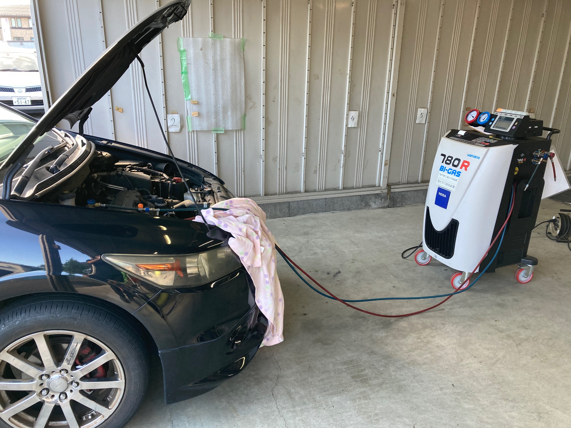 おクルマと専用のマシンをつないで、R134aガスとオイルを回収・クリーニングして規定量を注入、より快適な夏のドライブにご好評いただいております♪♪
