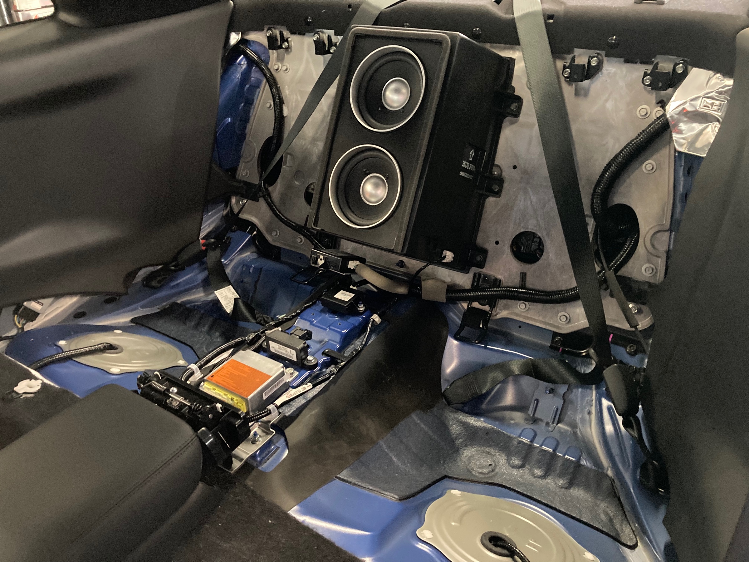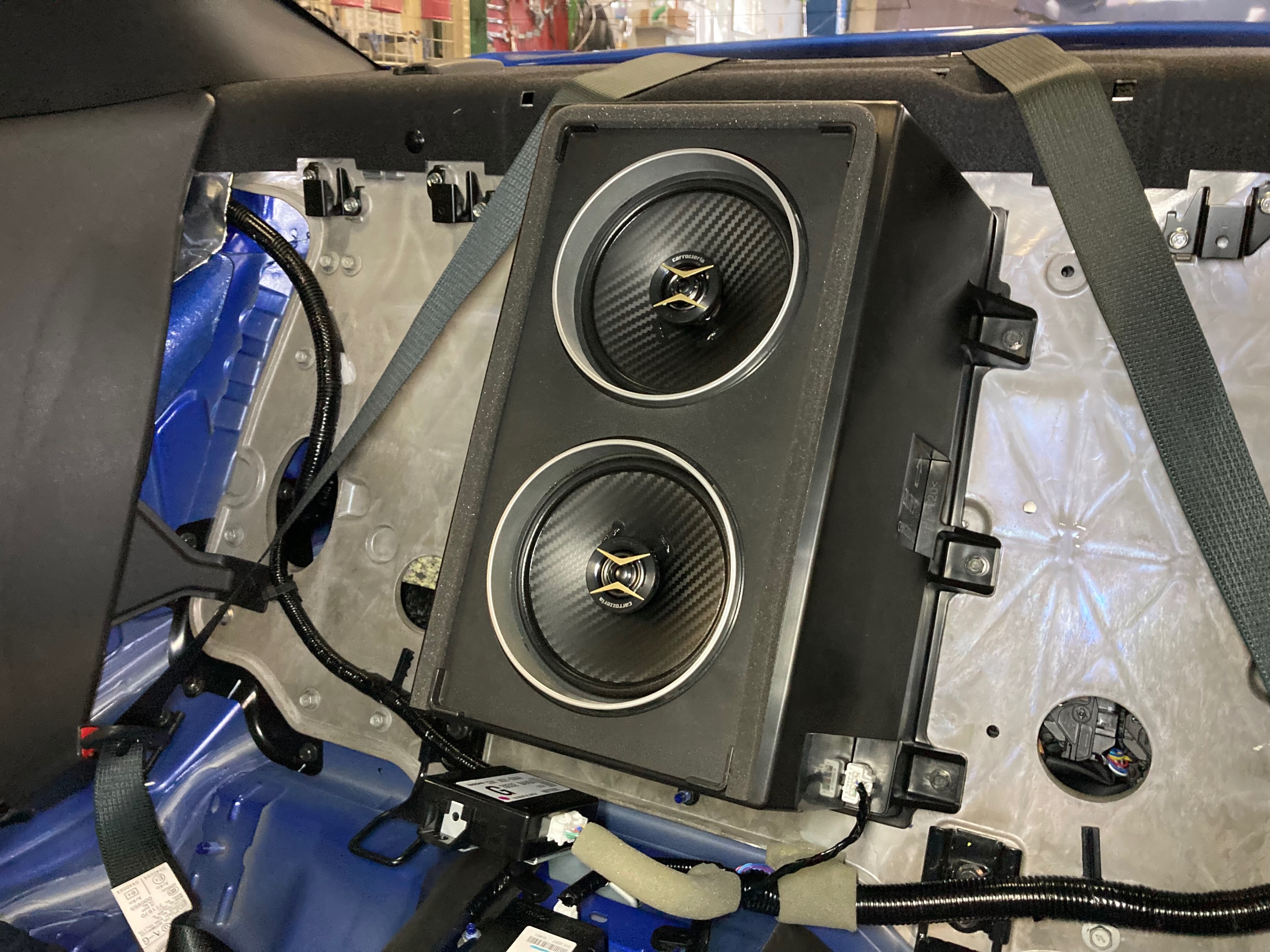 リヤシートとセンターパネルを取り外すと、スピーカーが上下にセットされるノーマルBOXが見えてきます。
