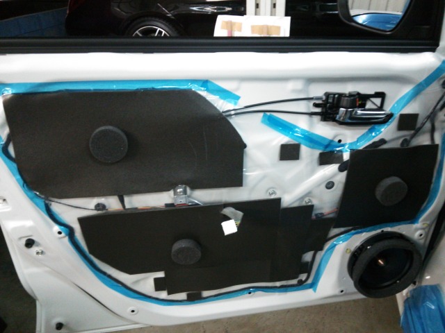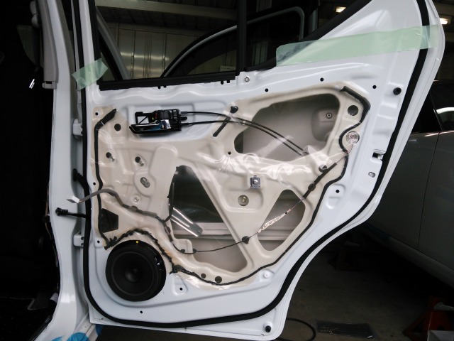 フロントから外したスピーカーはリヤへ移設。ドア内部への配線作業が必要となります。