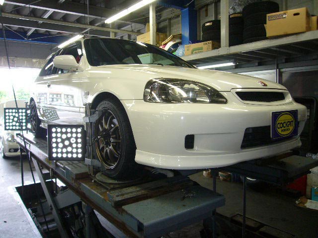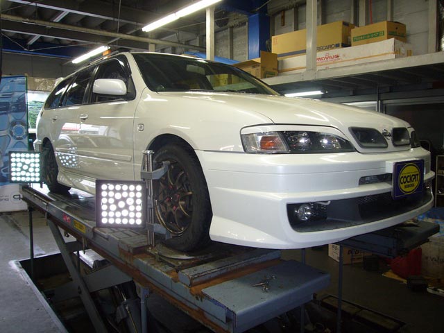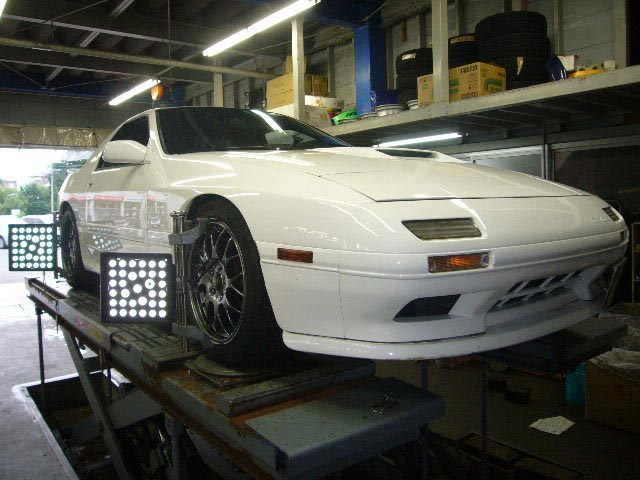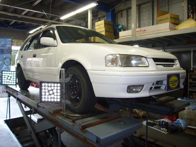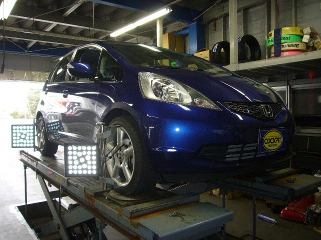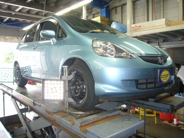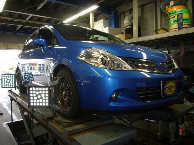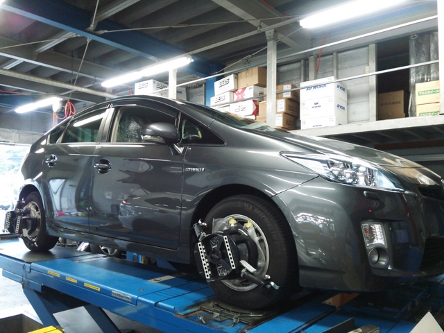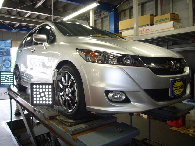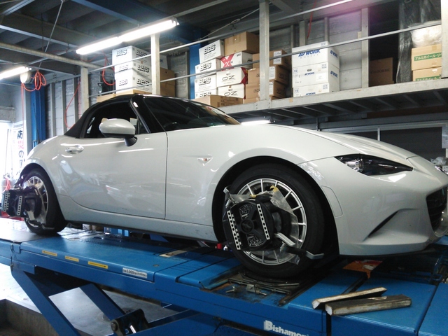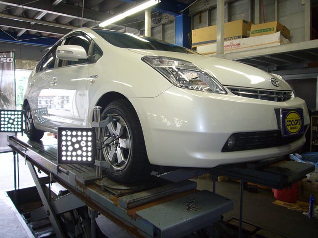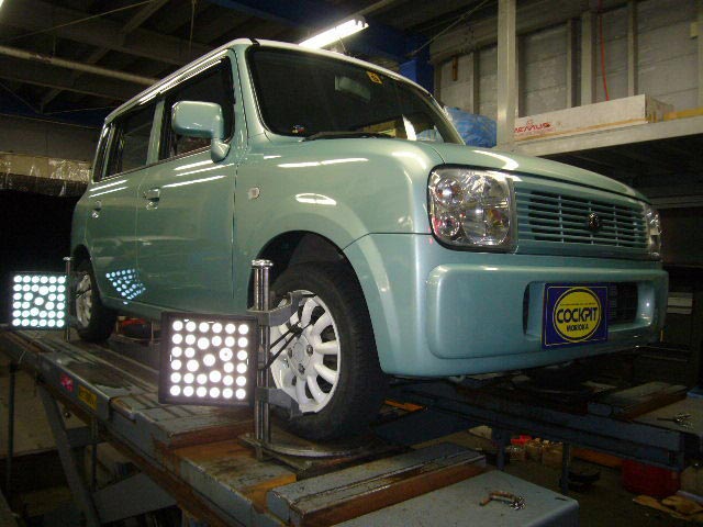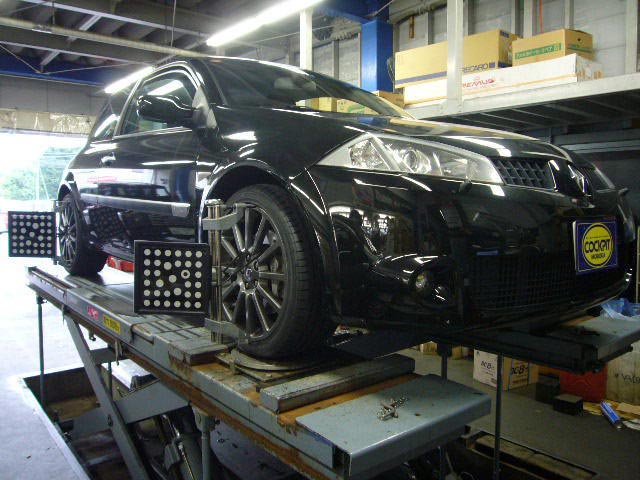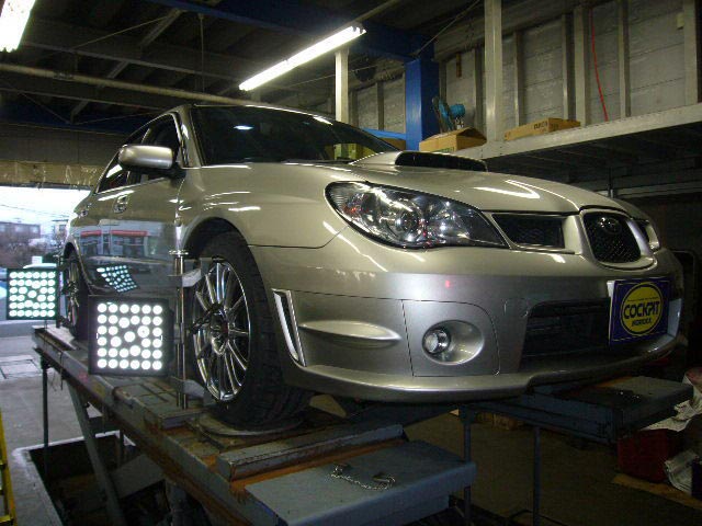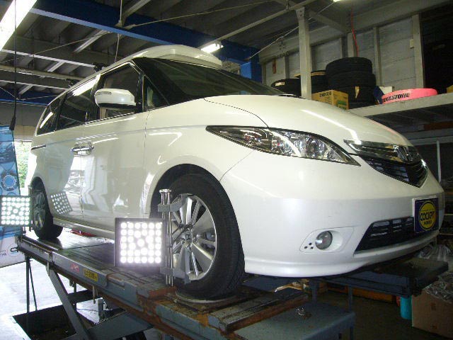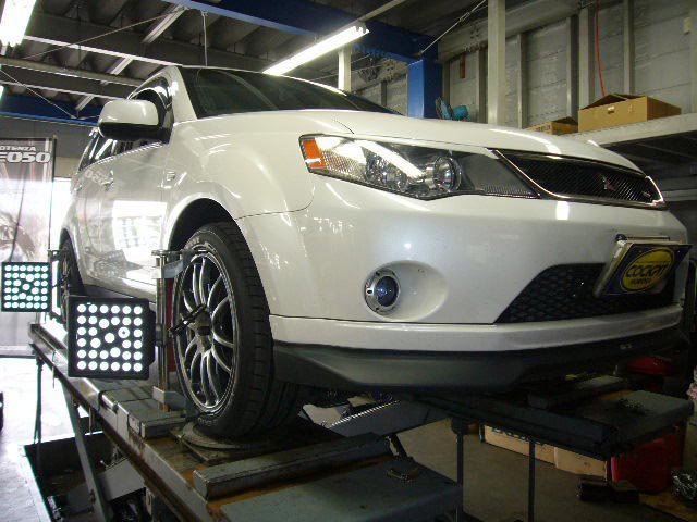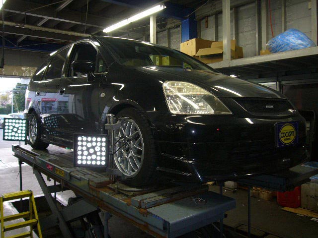 まず、はじめに車輌の状態(ハブベアリング、ボールジョイント類など全般)の点検後、問題がなければ調整作業にはいります。