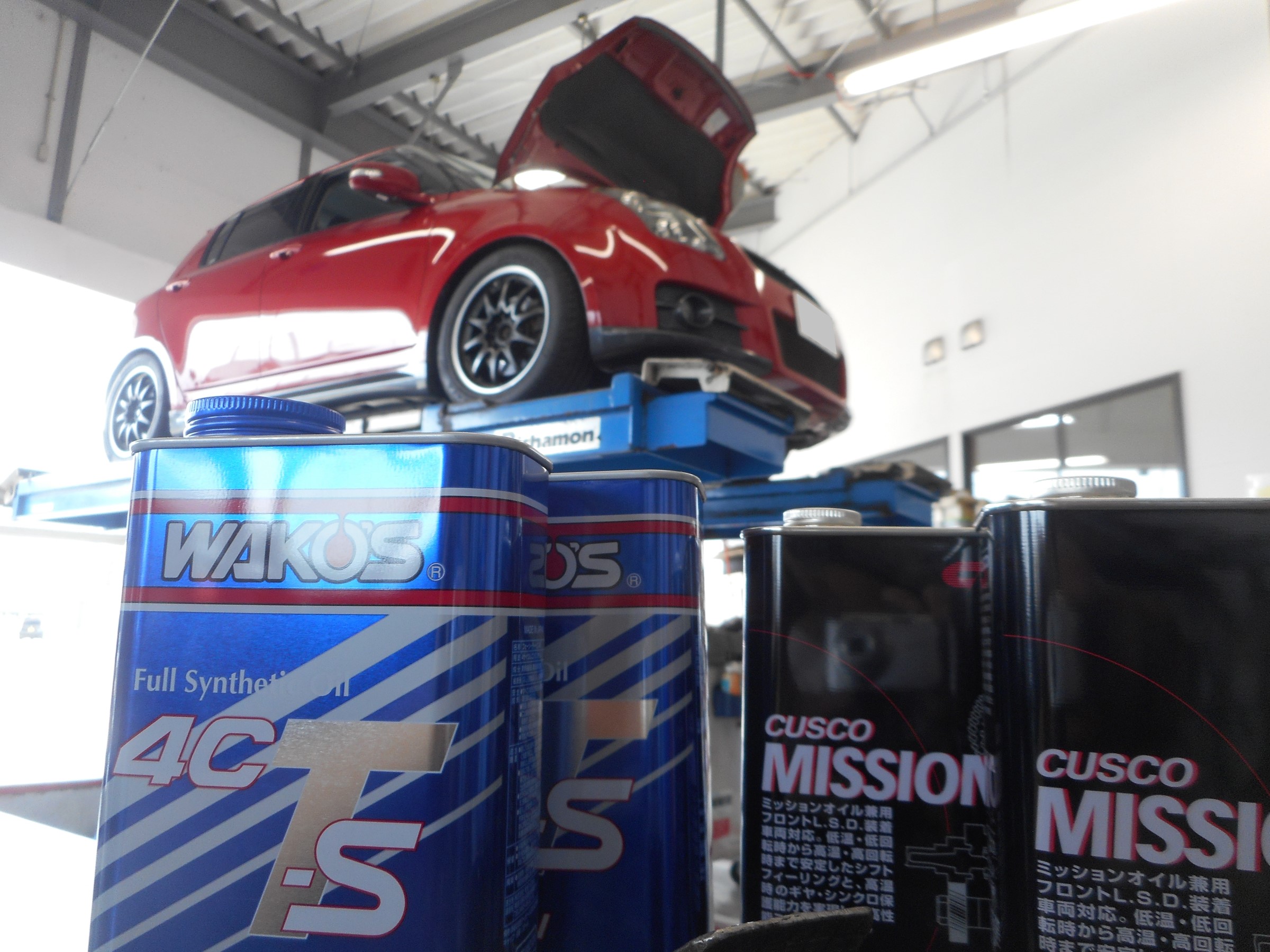 次に、スイフトスポーツのエンジンオイル交換と、ミッションオイルを交換します。エンジンオイルは当店オススメWAKO'S 4CT 5W-40、ミッションオイルはCUSCO 75W-85を使用しました。
