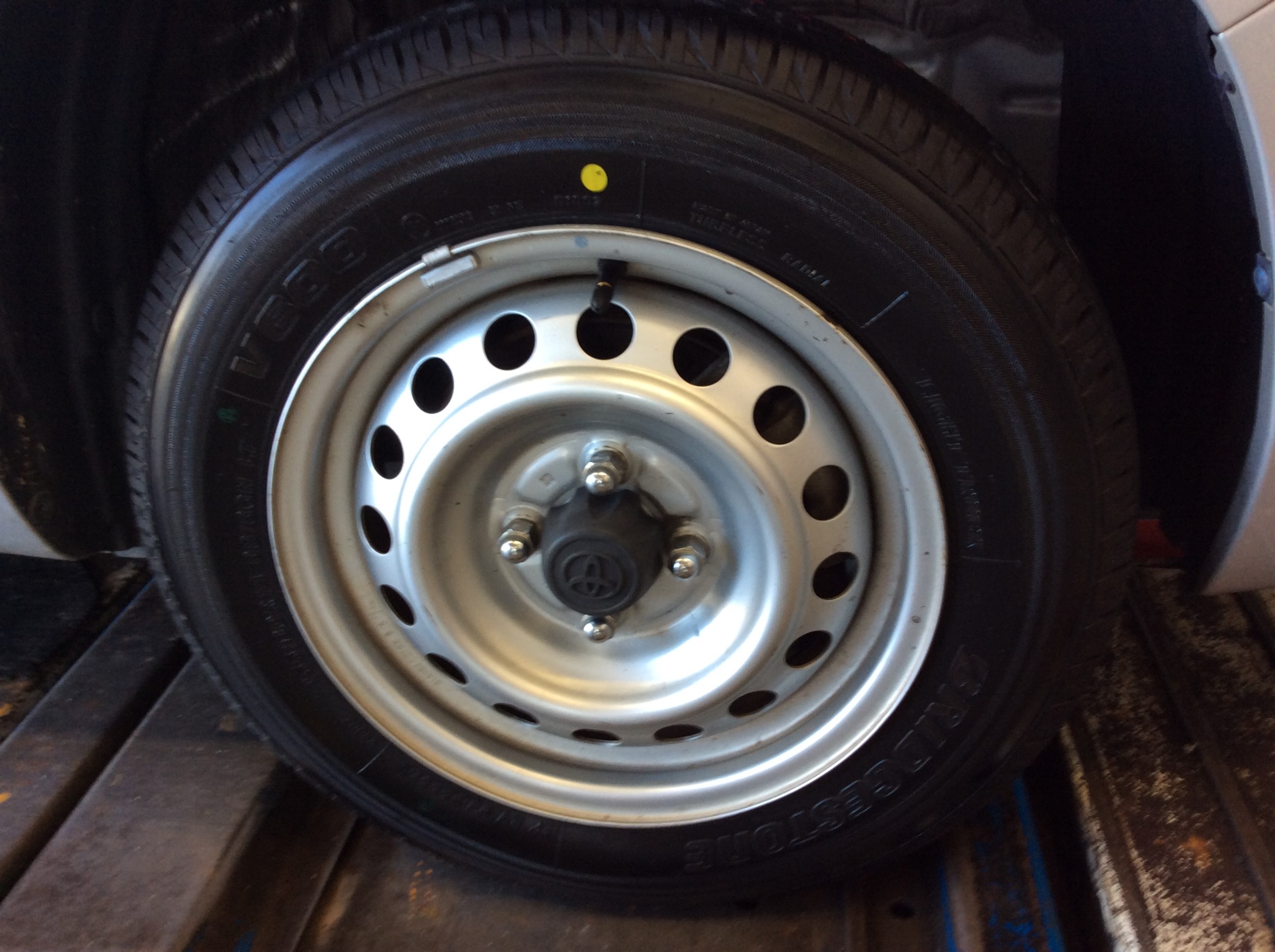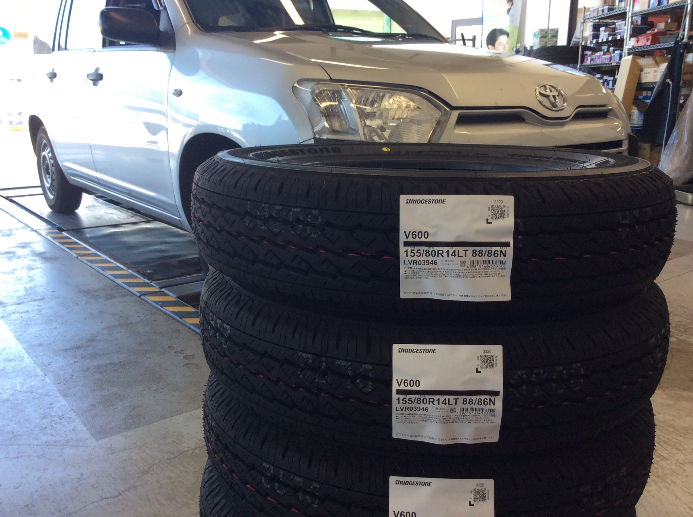 オイル交換中に、タイヤ点検したら減っておりました!お客様に説明しBRIDGESTONEの商用バン、小型トラック専用スタンダードタイヤのV600をご購入頂きました。