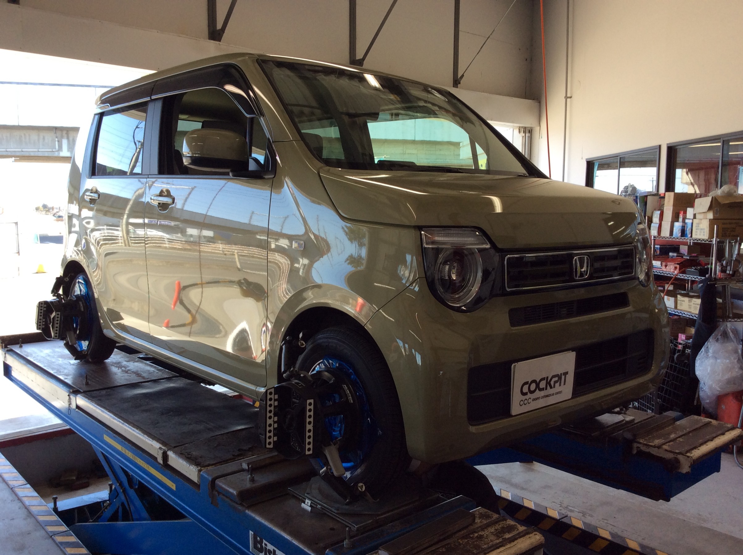 本日1台目のN-WGNです。純正ショックを加工されたそうですが乗り心地どうなんでしょうか?アライメントはしっかり調整しております。ご利用ありがとうございます!