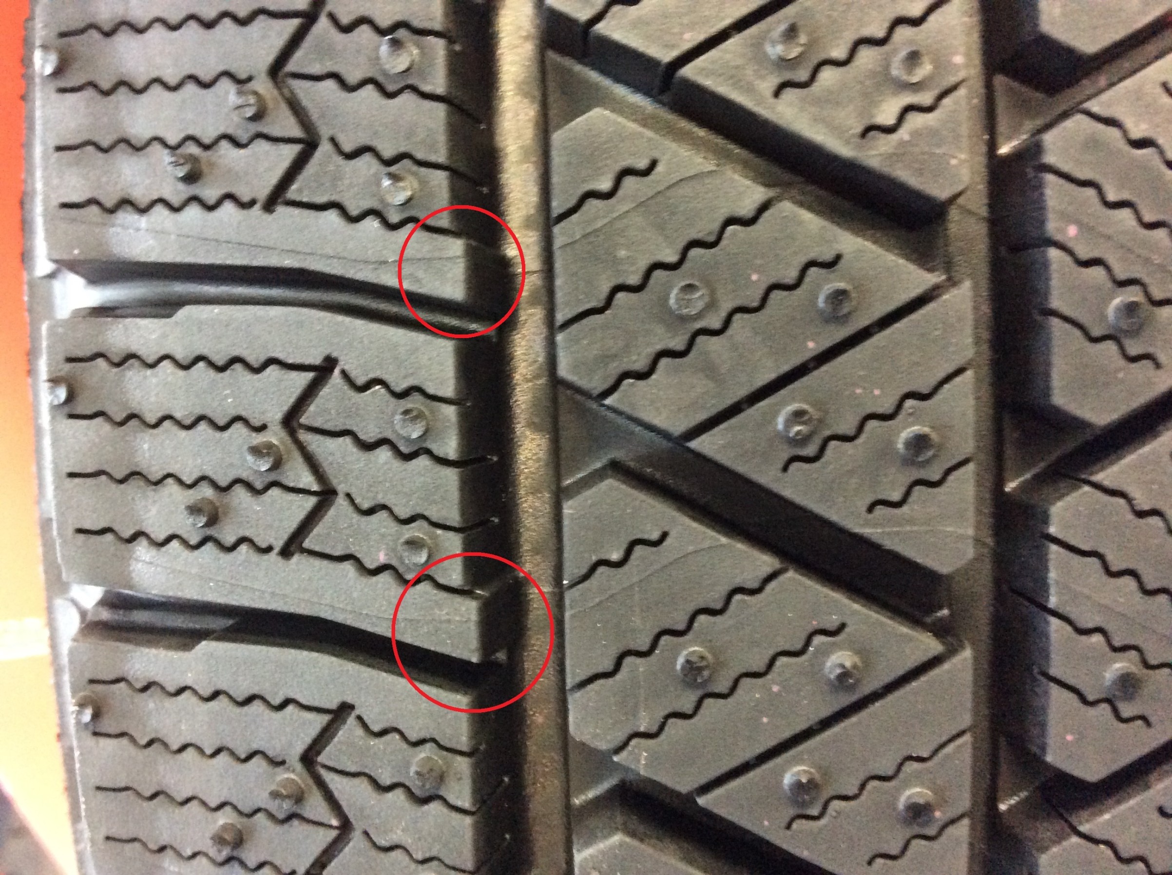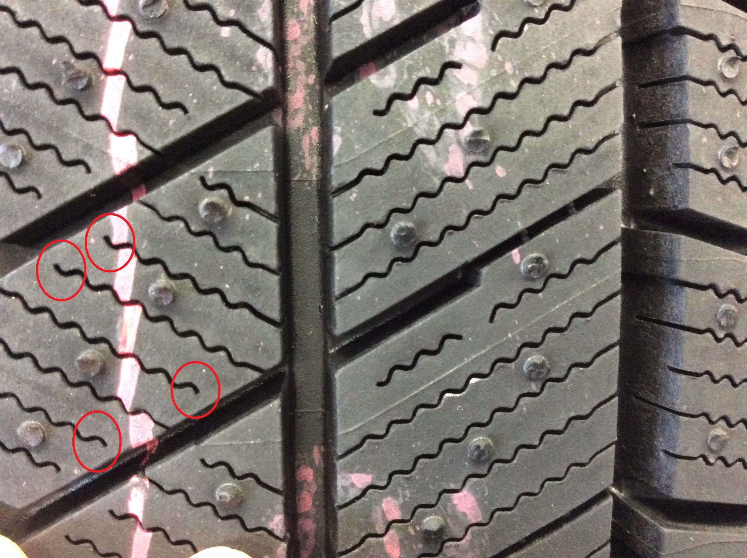 またサイプの一部の端(赤丸部分)を貫通させない(端止めサイプ)ことで、サイプ内への余計な水の侵入を抑制し接地を向上。