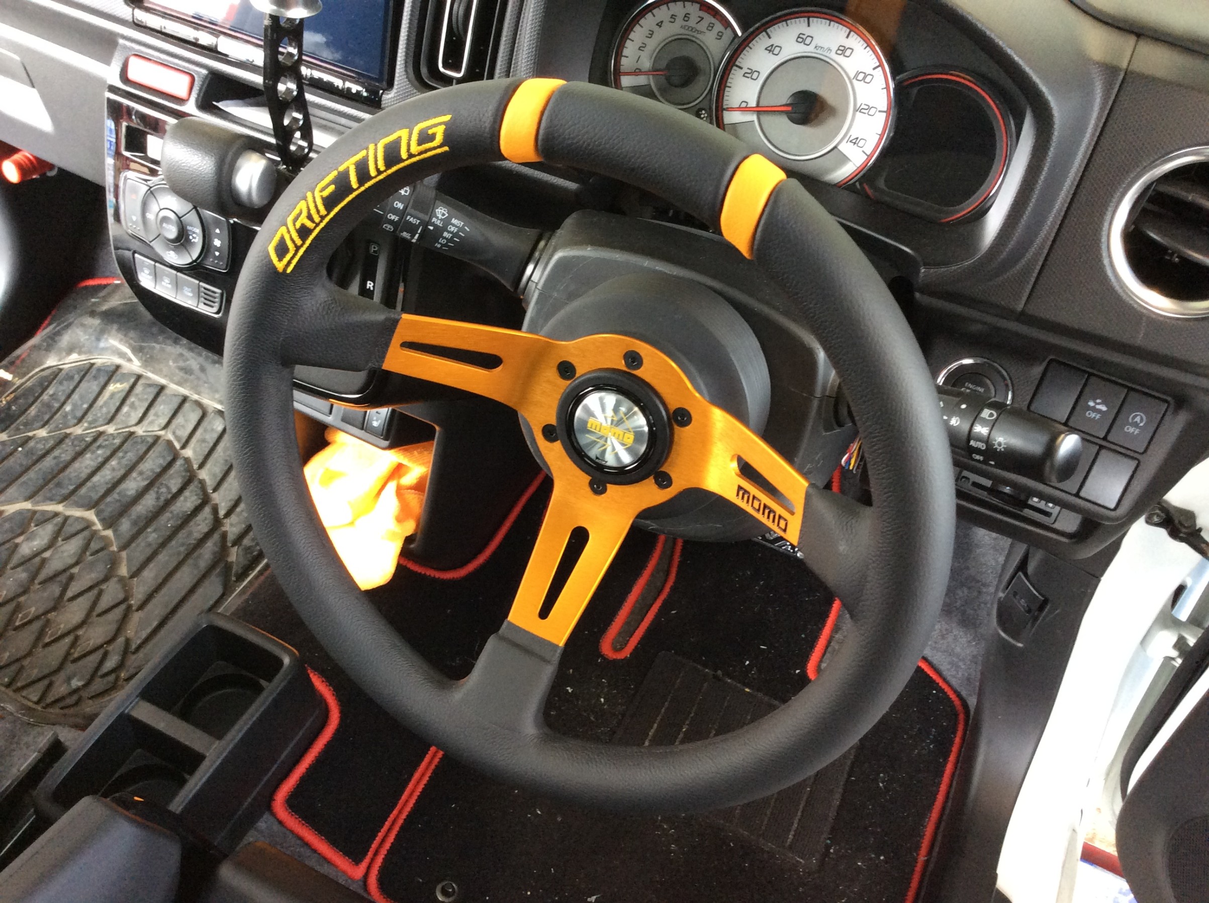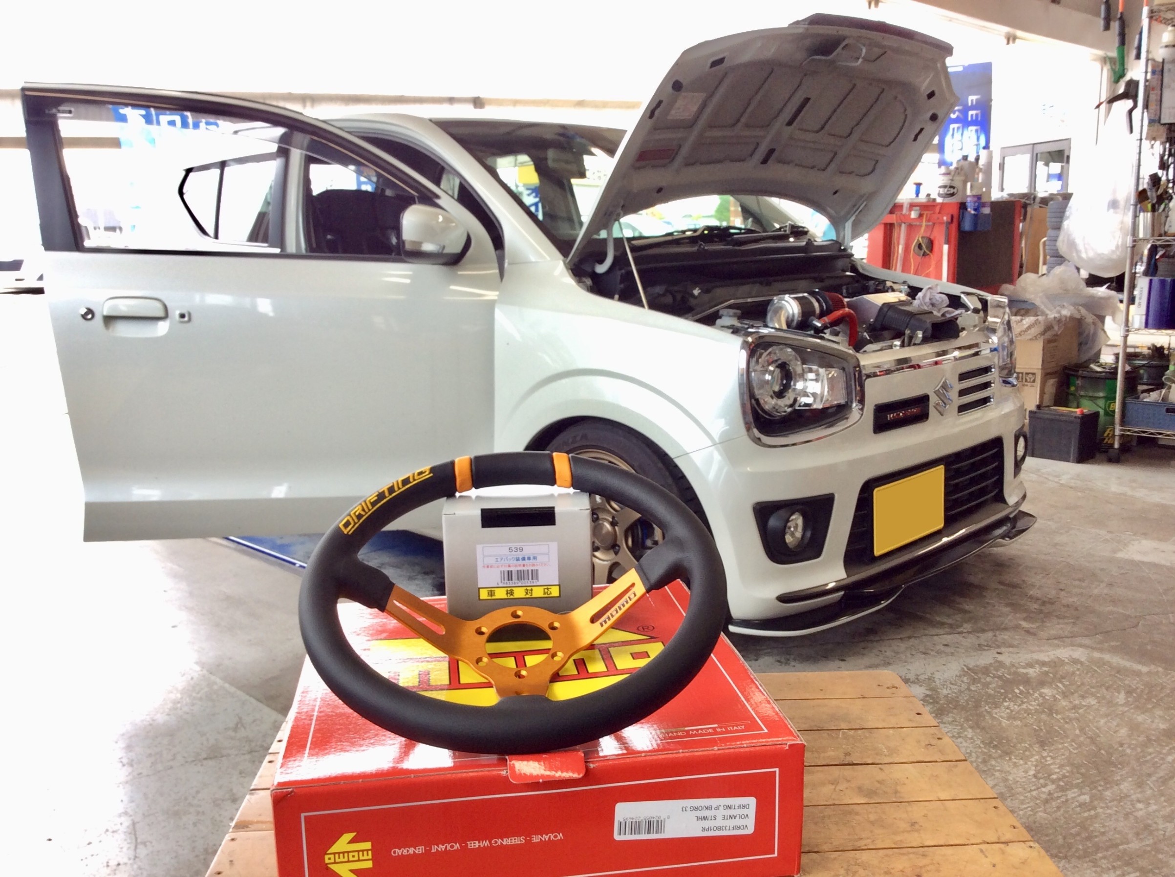 前回、レカロシートをご購入頂きましたこちらのアルトターボRSですが、シート交換したらステアリングが気になりMOMOステアリングに変更します!