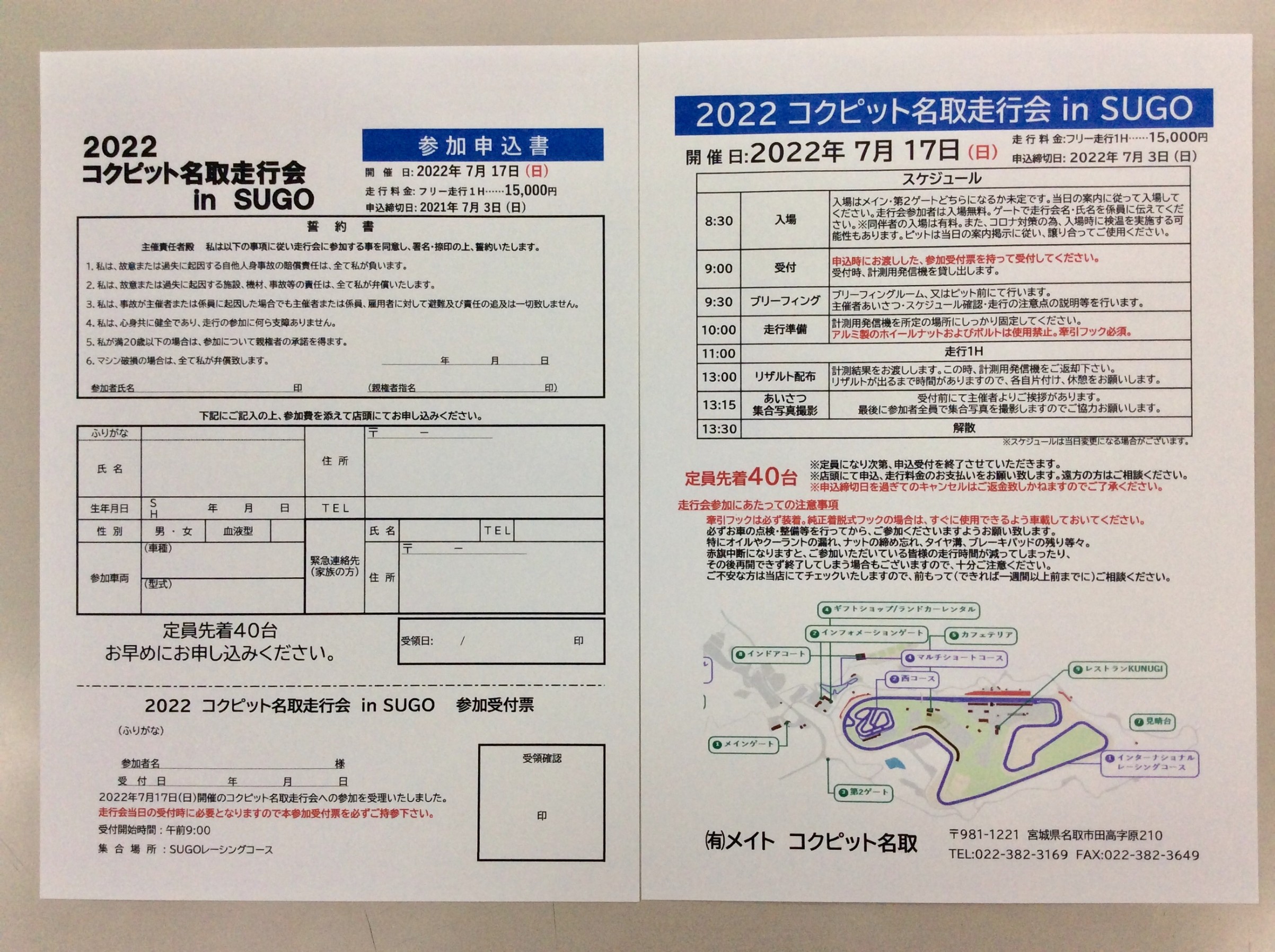 SUGO走行会の参加申込書が出来ましたので宜しくお願い致します。