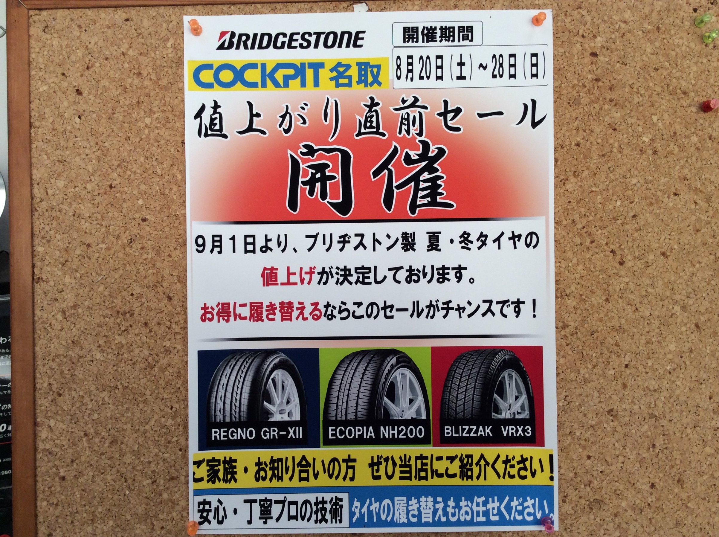 2022年8月19日 ツイート 明日8/20日(土)~8/28(日)まで夏タイヤ、スタッドレスタイヤなどのセールを開催いたします!値上がり前の今がチャンスですのでよろしくお願い致します! #BRIDGESTONE #ブリヂストン専門店 #値上げ前 #セール #夏タイヤ #スタッドレスタイヤ #コクピット #名取市 Prev Next