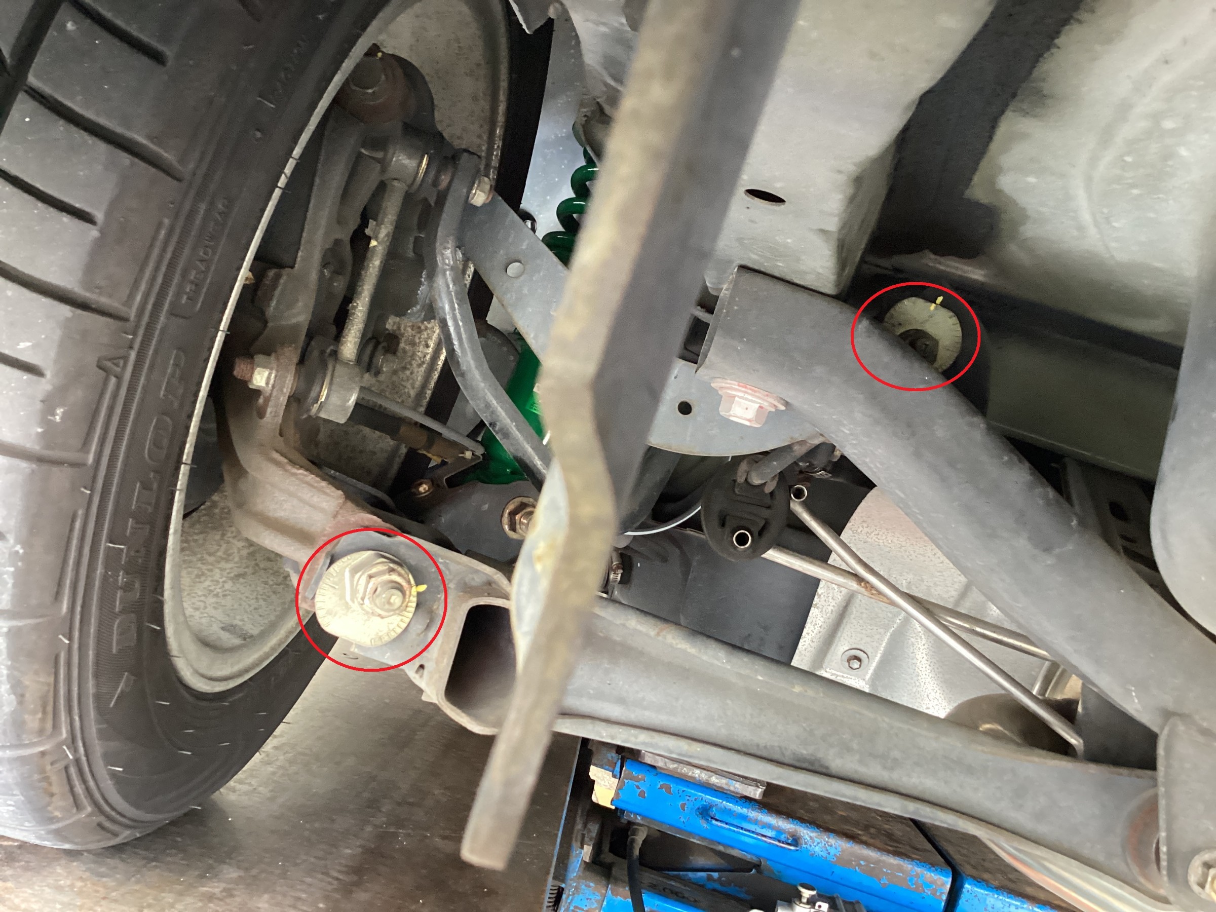 赤丸が調整するリヤ キャンバー、トー部分です!