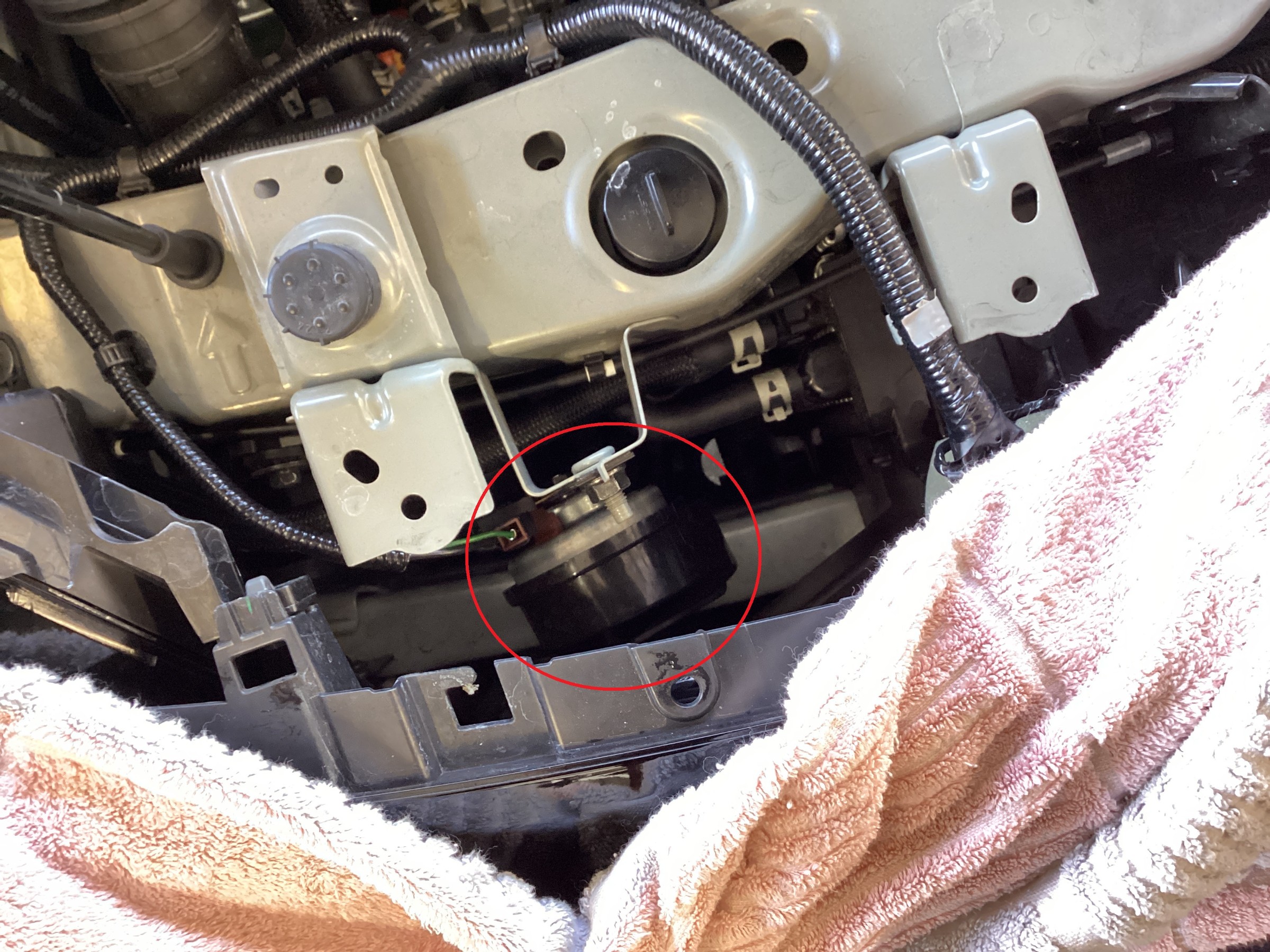 純正ホーン(赤丸部分)は一個だけなのでサッと取り外し・・・