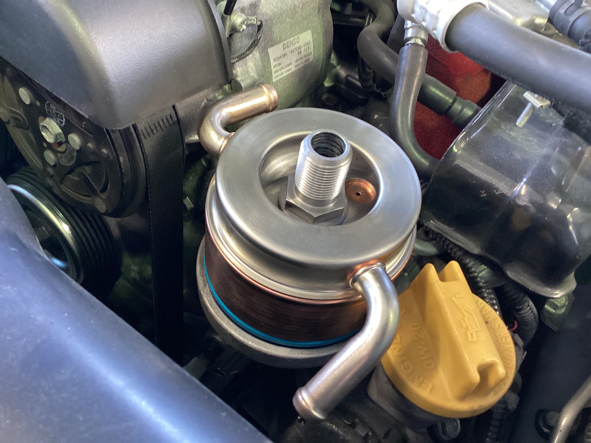 オイルエレメントを外しオイルクーラー本体を取り付け・・・