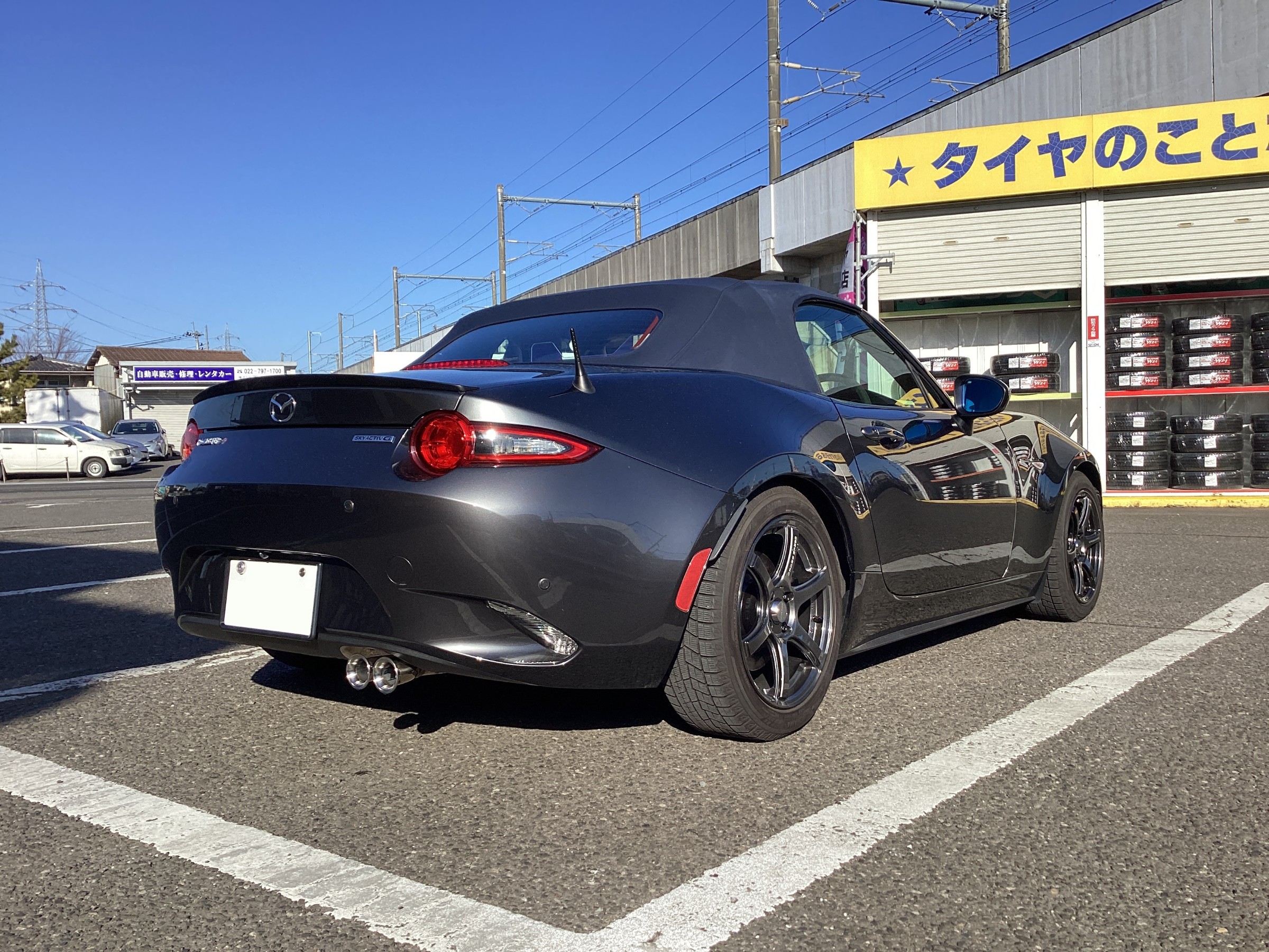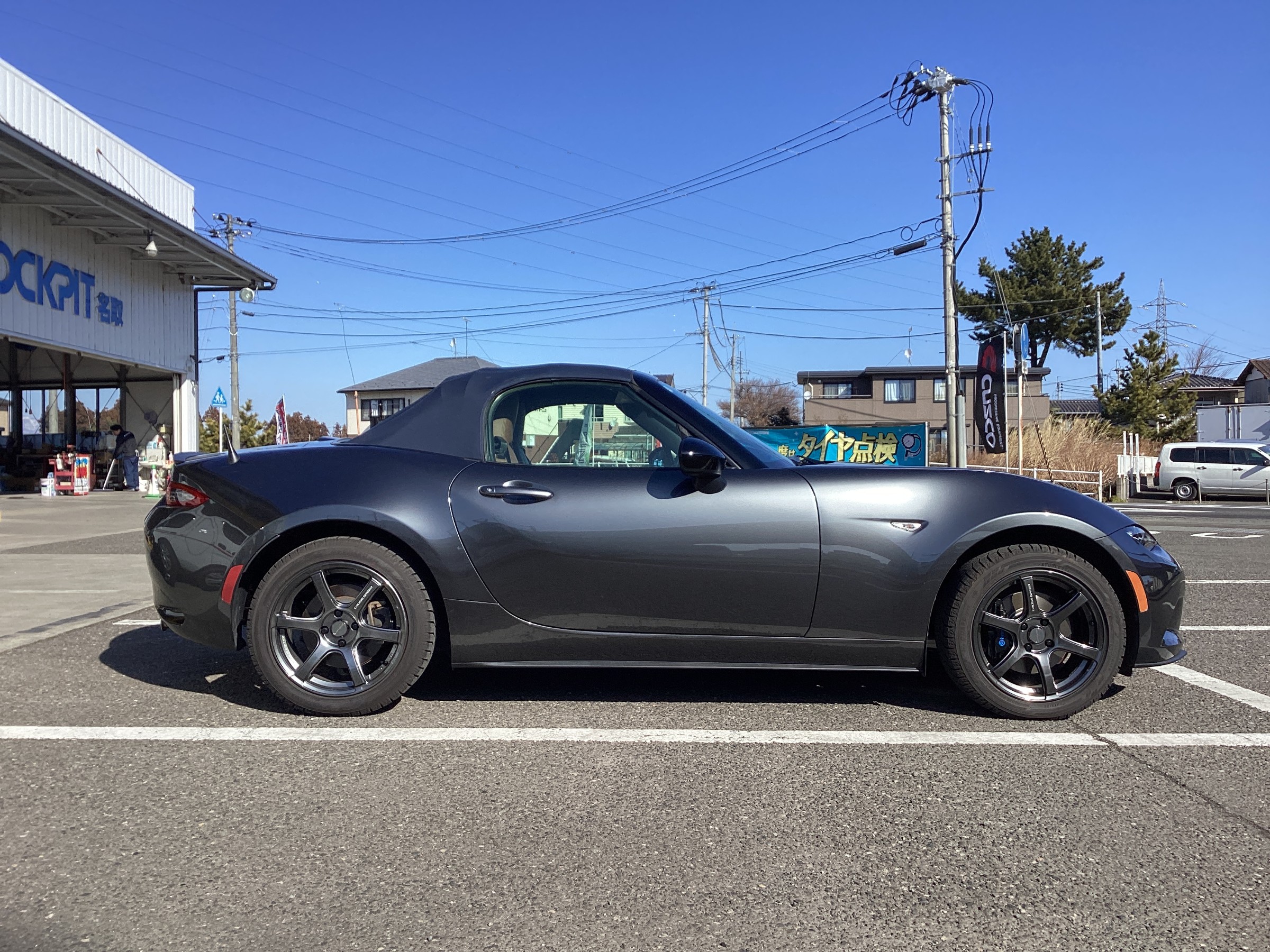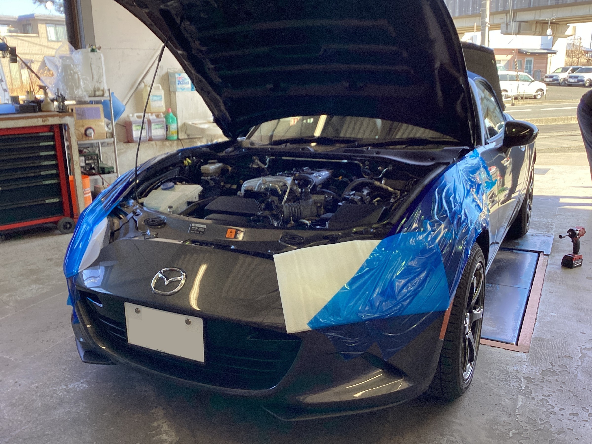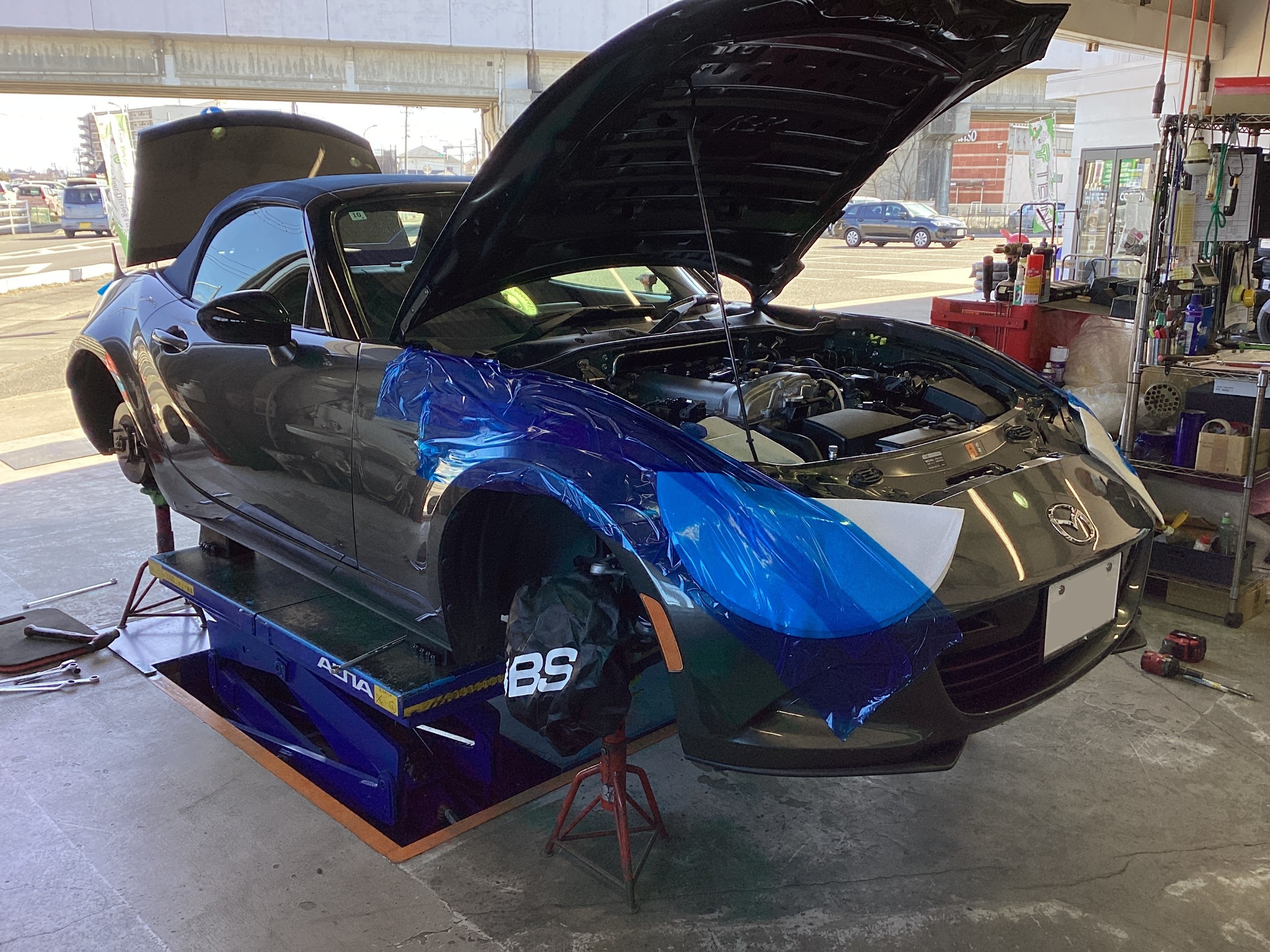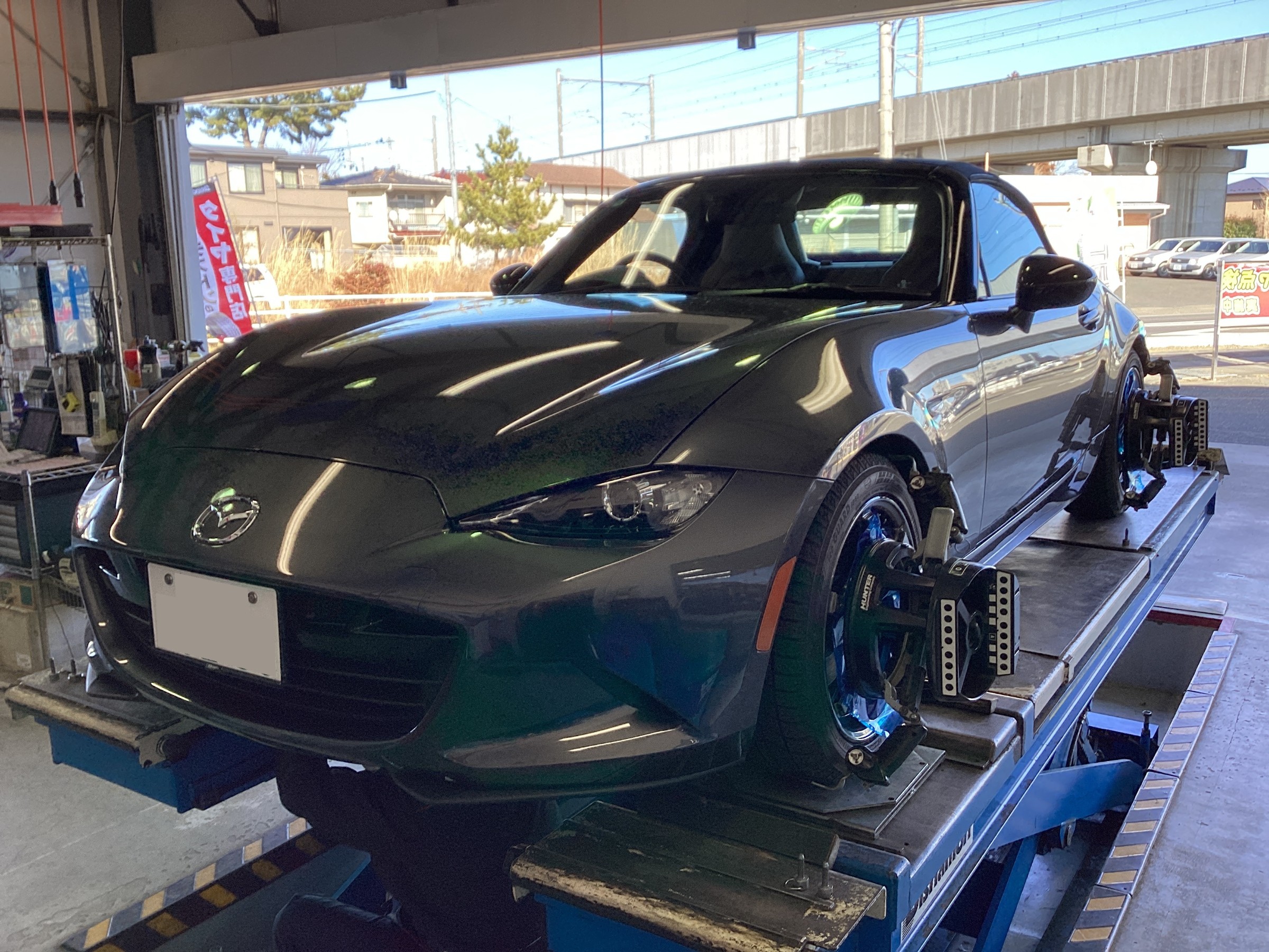 試乗後の仮アライメント調整中!調整箇所の多いロードスターですが、事前にお客様よりお話を伺っていたのでアレンジしたアライメント数値にて調整!