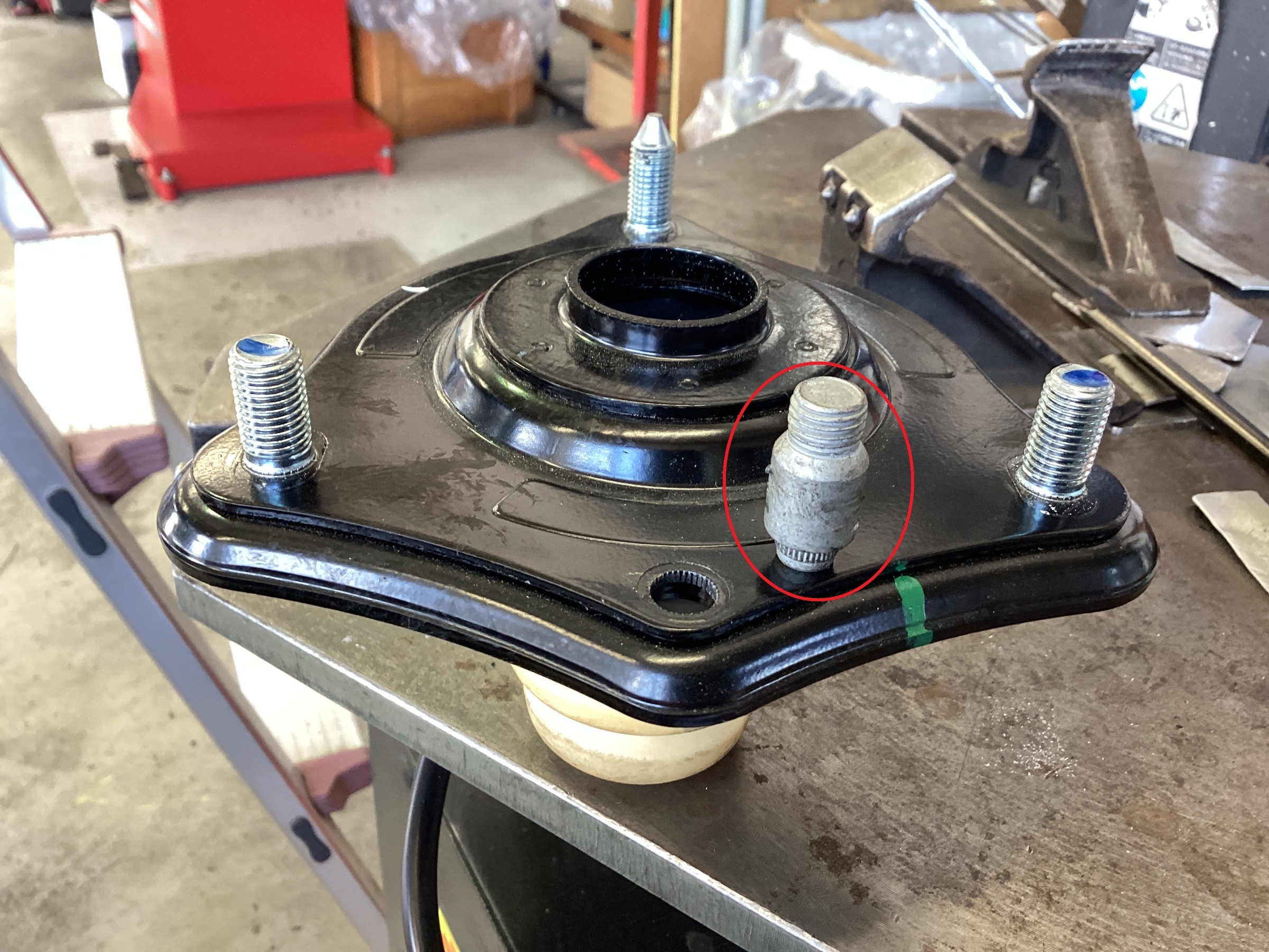 純正バンプラバーをちょっとだけカットして、若干キャンバーを付けるために純正アッパーマウントに付いている赤丸部分のピンを車両に取り付ける前に抜いておきます!