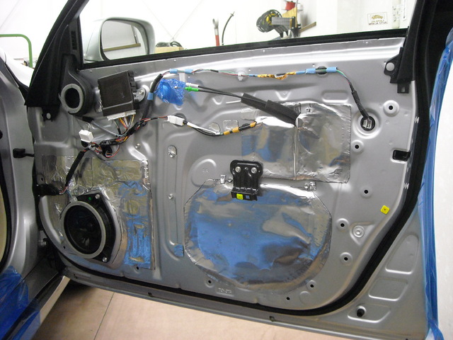 最初はドアの内側、アウターパネルに制振シートをヒートガンで充分に温めて、しっかりと圧着します。その上から吸音シートをスピーカー裏を中心に制振シートの上から貼り付けていきます(中高音がハッキリと聞こえるようになります)。