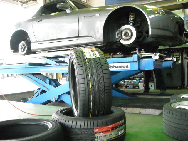 タイヤを新品(F 215/R17 R245/40R17 ポテンザRE050)に交換するついでに、車高調が付いているのでフロント2cm、リア1cm下げました。
