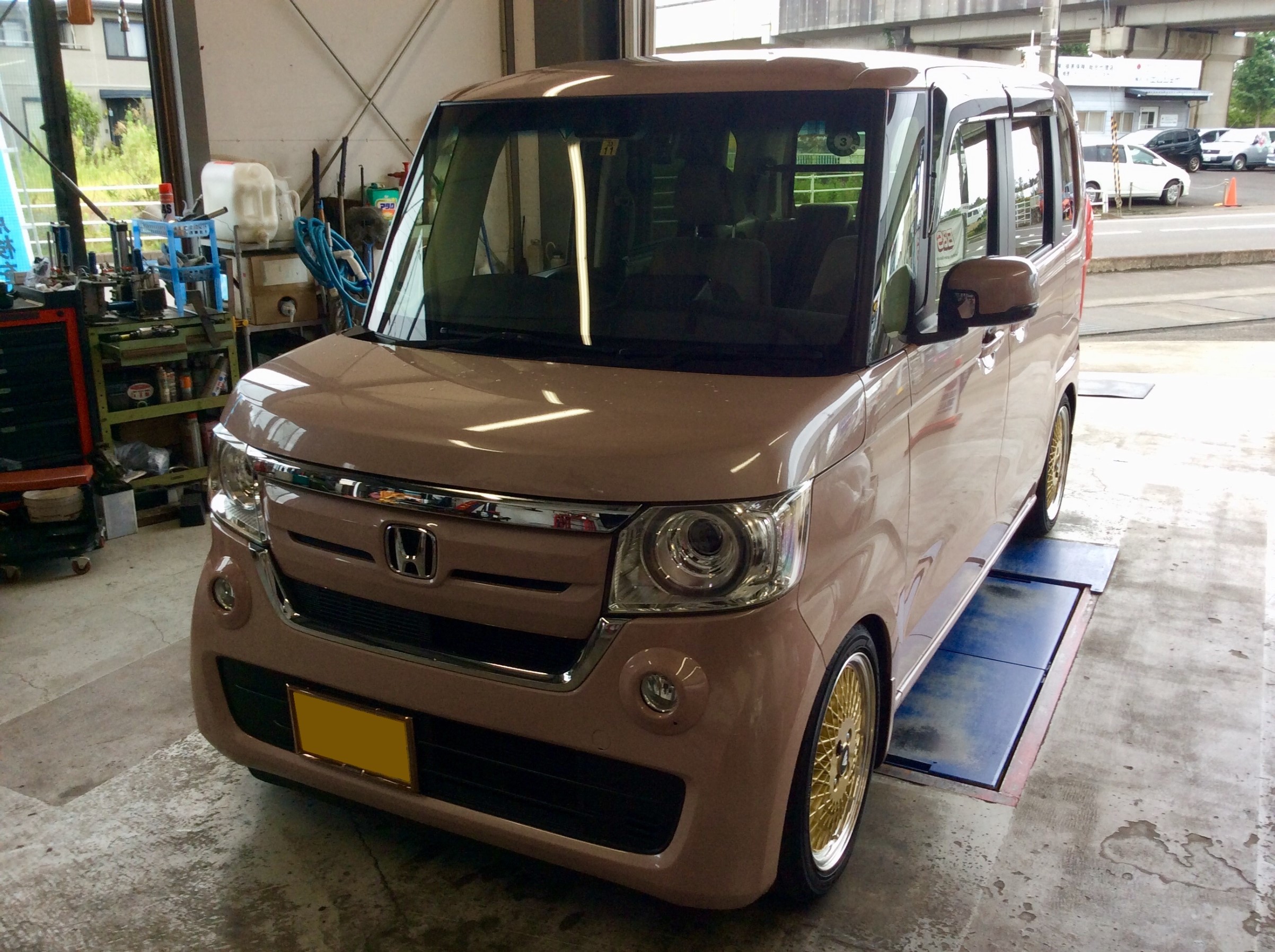 こちらのN-BOXに取り付けますが、足回りは、お客様自身で交換されたそうですΣ(゚Д゚)
