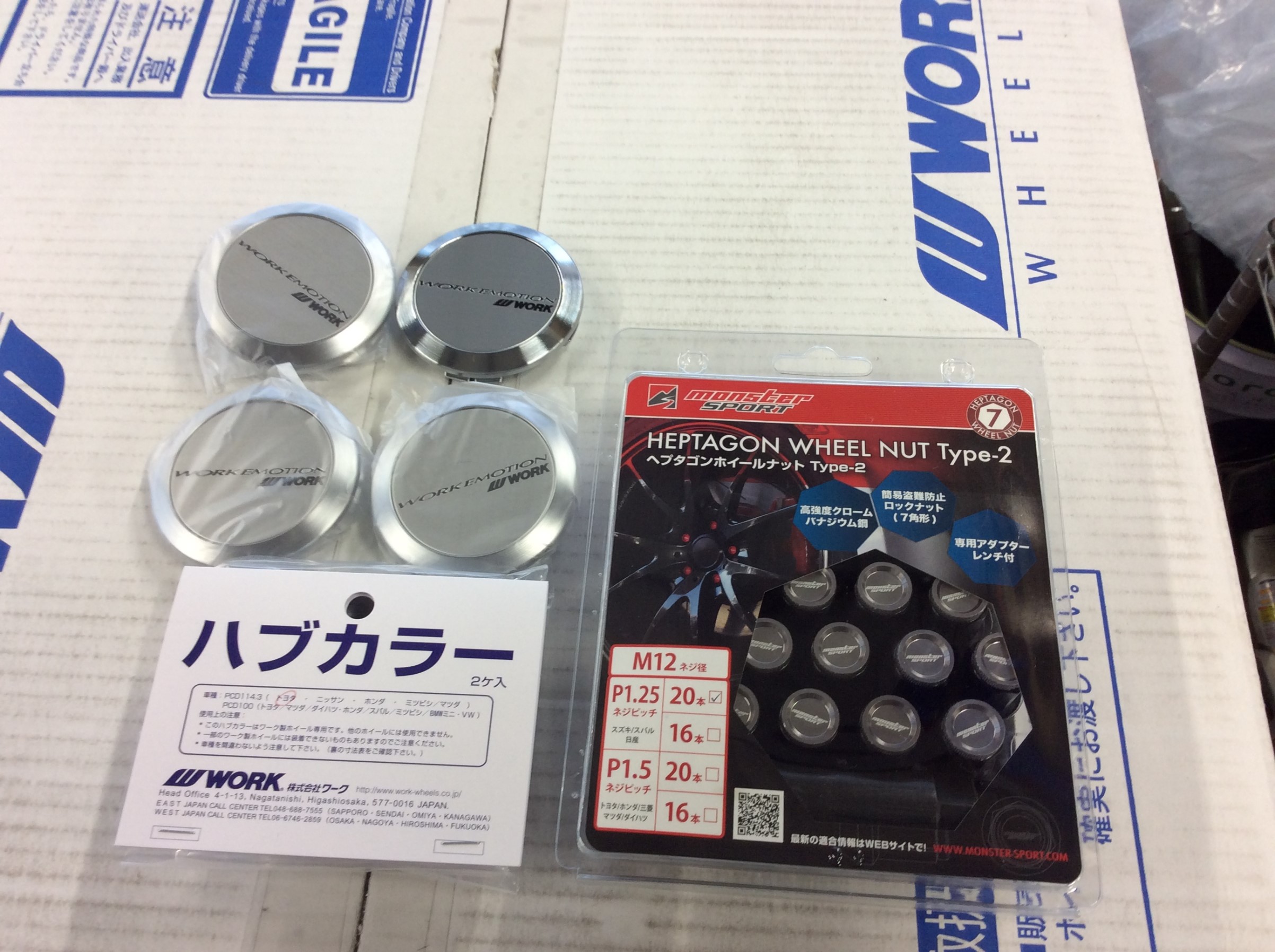 ナットもMONSTER SPORTに、ハブカラーも使って取り付けます。キャップはフラットのシルバーに!