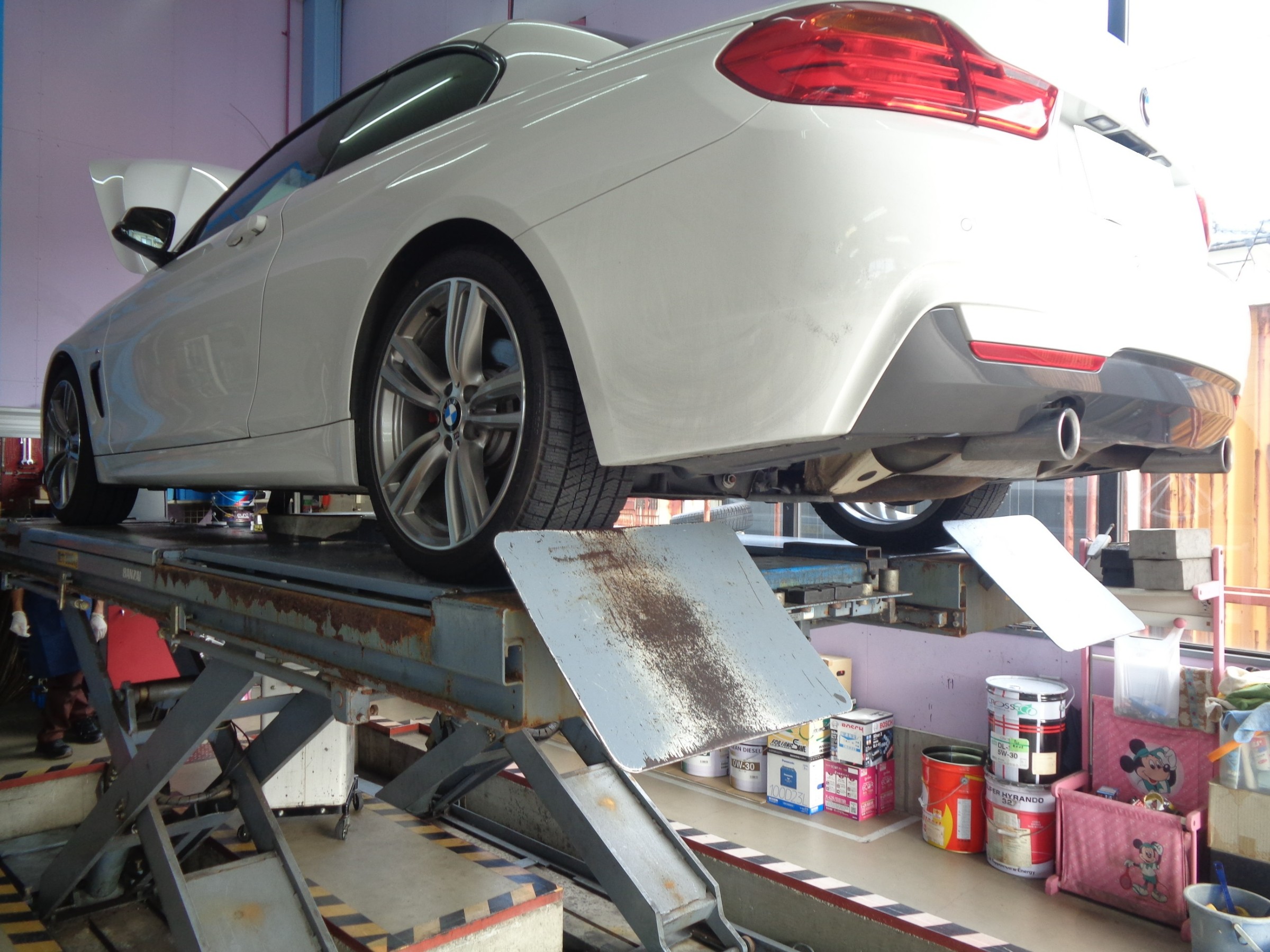 車検&エンジンオイル交換ほかメンテナンス中。↓