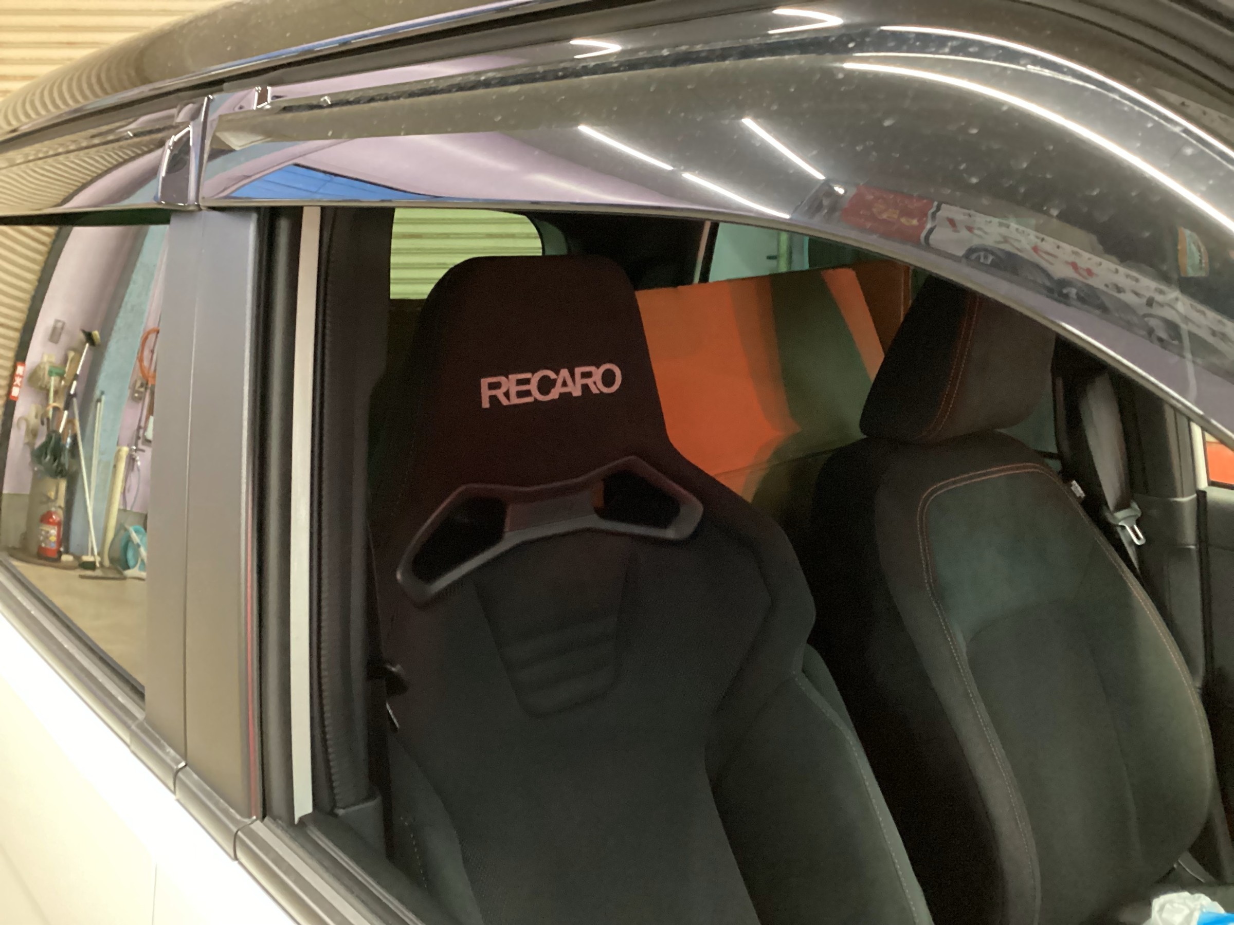 フロントガラス越しに見えるヘッドレストの【RECARO】の