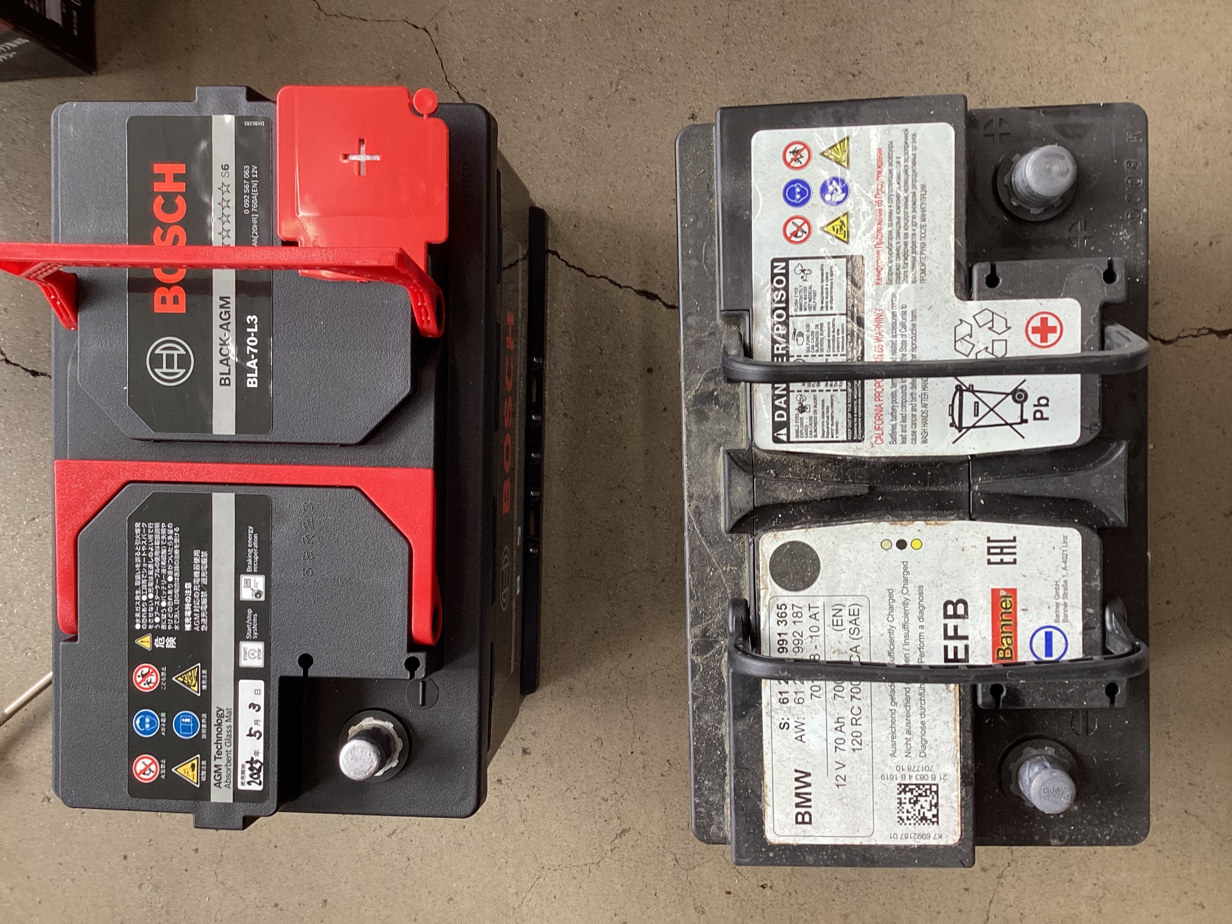 左が交換するボッシュさんAGMバッテリー。↓