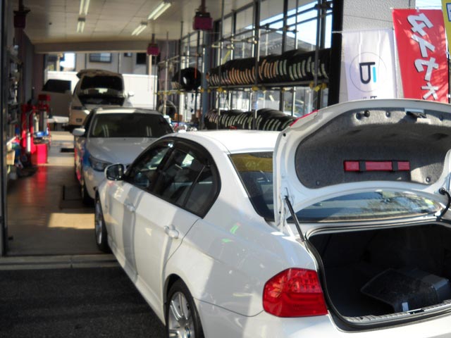 手前がTVキャンセラーの取り付けで入庫しているBMW 3シリーズ E90。