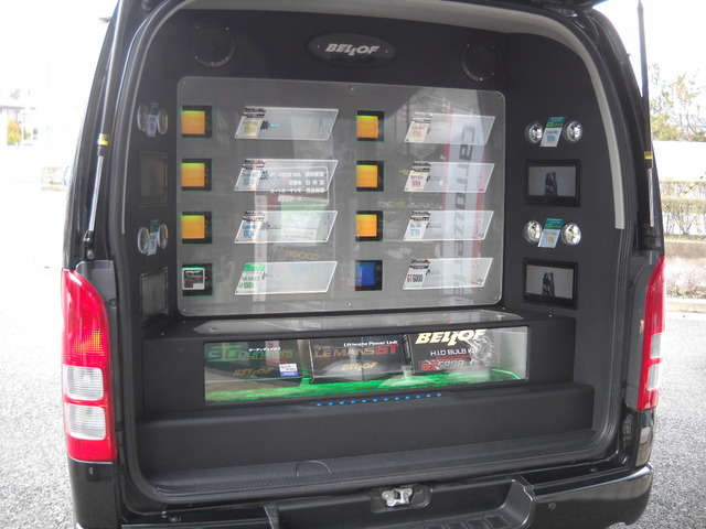 リアハッチを開けると、HIDのデモ点灯機がずらり!