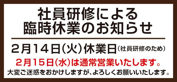 2月14日(火)は社員研修の為、休業日とさせていただきます。